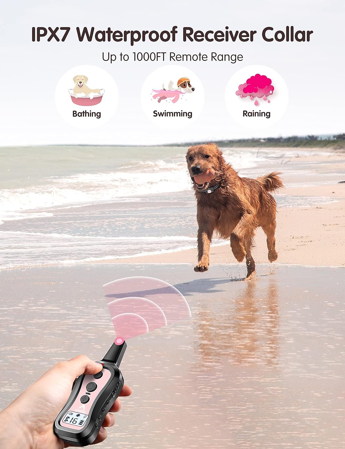 IPX7 waterproof receiver: The receiver collar is IPX7 waterproof, don’t worry about failure in water(Note: Remote control is not waterproof)