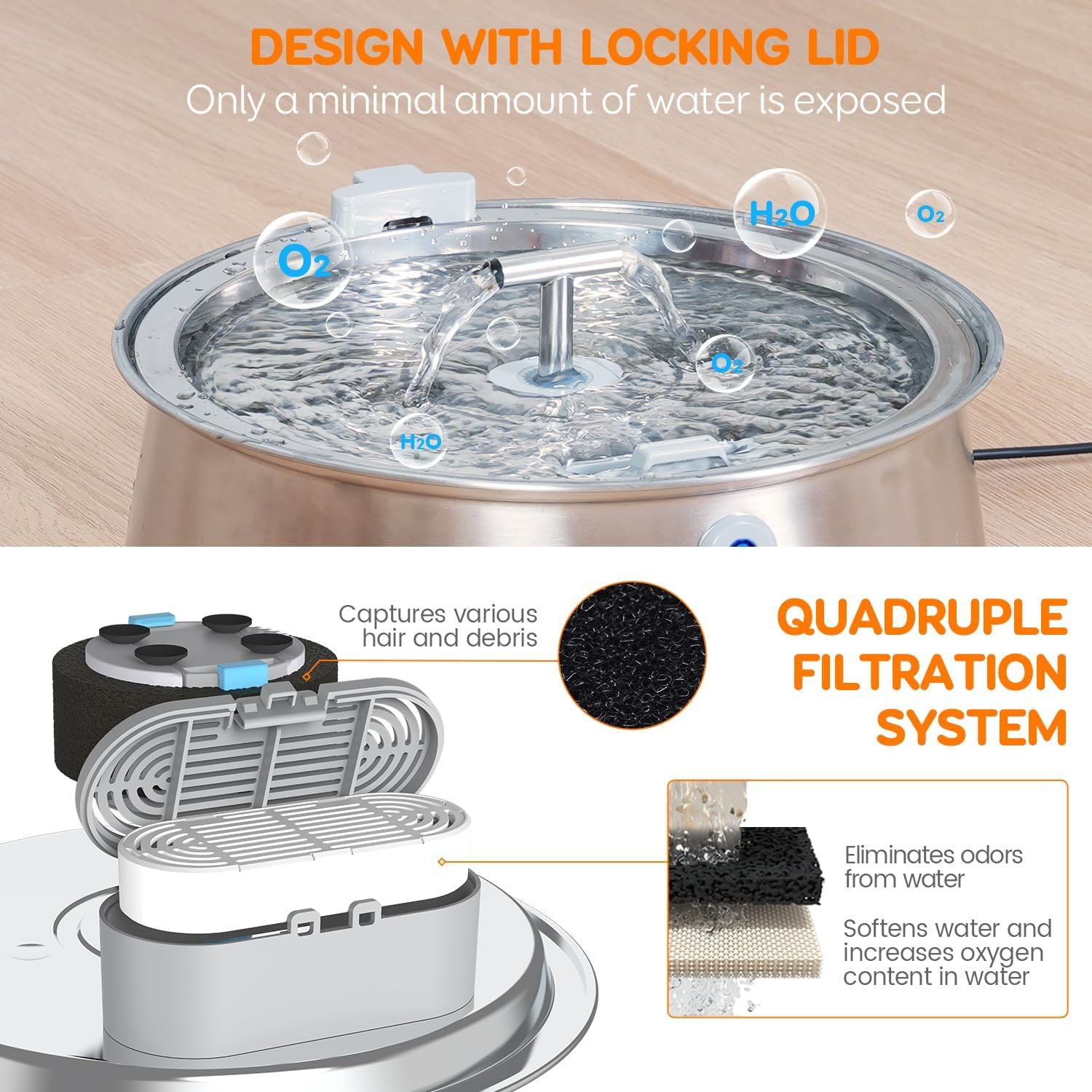 Reliable Quadruple Filtration System: This dog water dispenser includes a charcoal filter and a sponge filter. The charcoal filter consists of ion exchange resin and coconut shell activated carbon, which can remove odor and purify water, increasing the oxygen content of water. The sponge filter can filter out dirt, fur, and other impurities, providing fresh and clean for your pets.