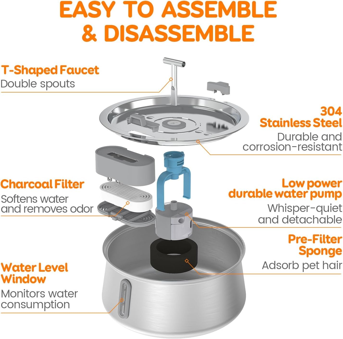 Easy to Assemble & Disassemble: This cat fountains for drinking stainless steel is composed of stainless steel tank, cover, water pump, and filtration system. It arrives fully installed, with no assembly required. We recommend replacing filters and cleaning the water pump and tank 2-4 weeks. We’ve included a detailed user manual to help you easily reassemble it.