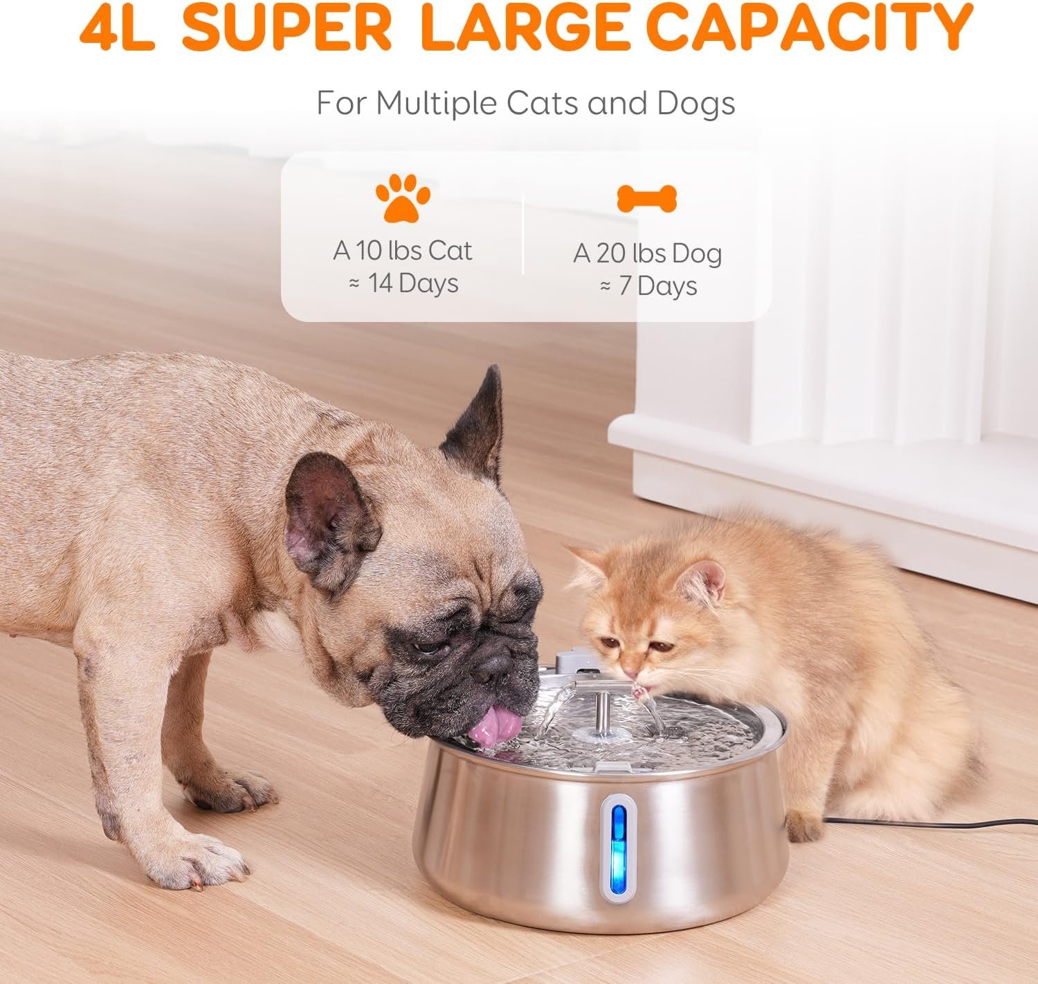 4L/135oz Super Large Capacity & 2 Spouts: This pet water dispenser for cats inside is designed with a double-spout faucet that’s perfect for multiple pets. This 4L cat fountain can keep your pets hydrated for a week with just one fill. Even when you’re traveling, your pets can be well taken care of with an ample supply of water.