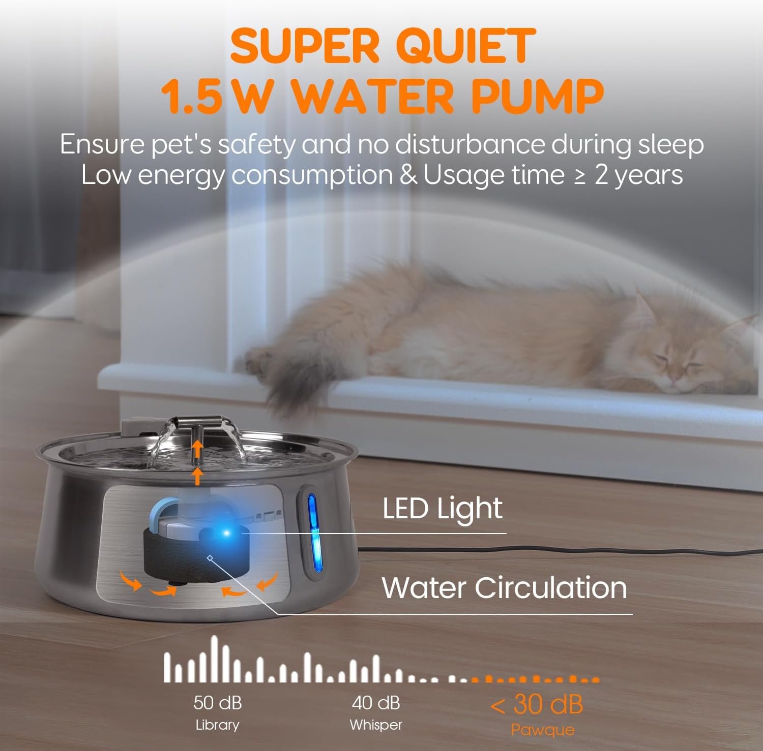 Super Quiet & Low Power Water Pump: Pawque stainless steel cat water fountain comes with a 1.5 W low-power water pump that stays below 30 dB, keeping you sleep in an ultra-quiet environment. Keep in mind that a regular refilling is essential for the pet water fountain for cats as the pump runs continuously. Running a pump without water can cause a damage to it.