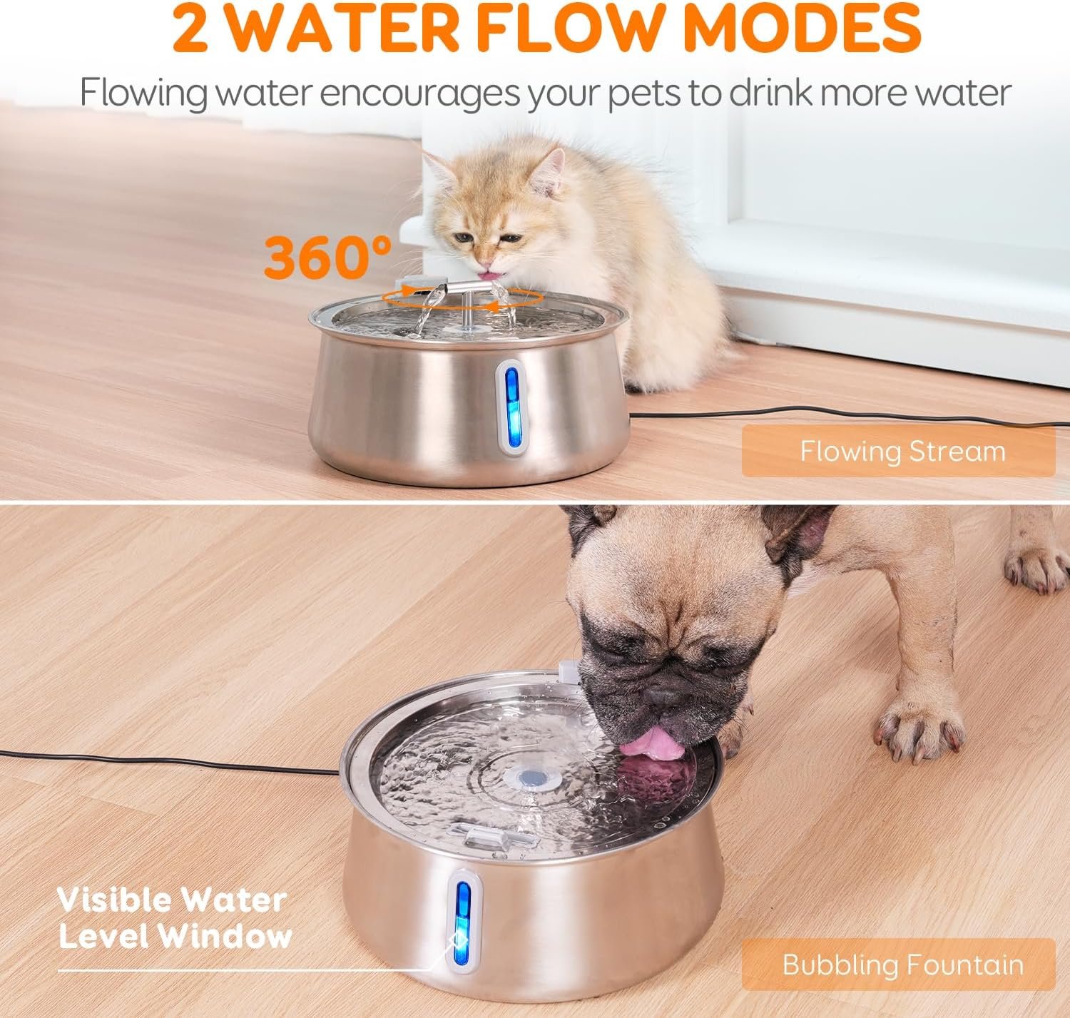 Water Level Window & Double Water Flow Design: This cat drinking fountain is equipped with a transparent water level window to monitor water consumption. This pet fountain features two water flow modes: flowing stream and bubbling fountain. Running water can encourage your pets to drink more, decreasing the risk of urinary tract infections and kidney disease.
