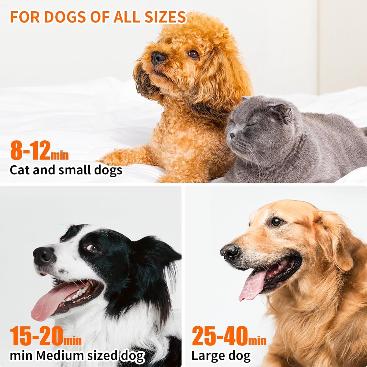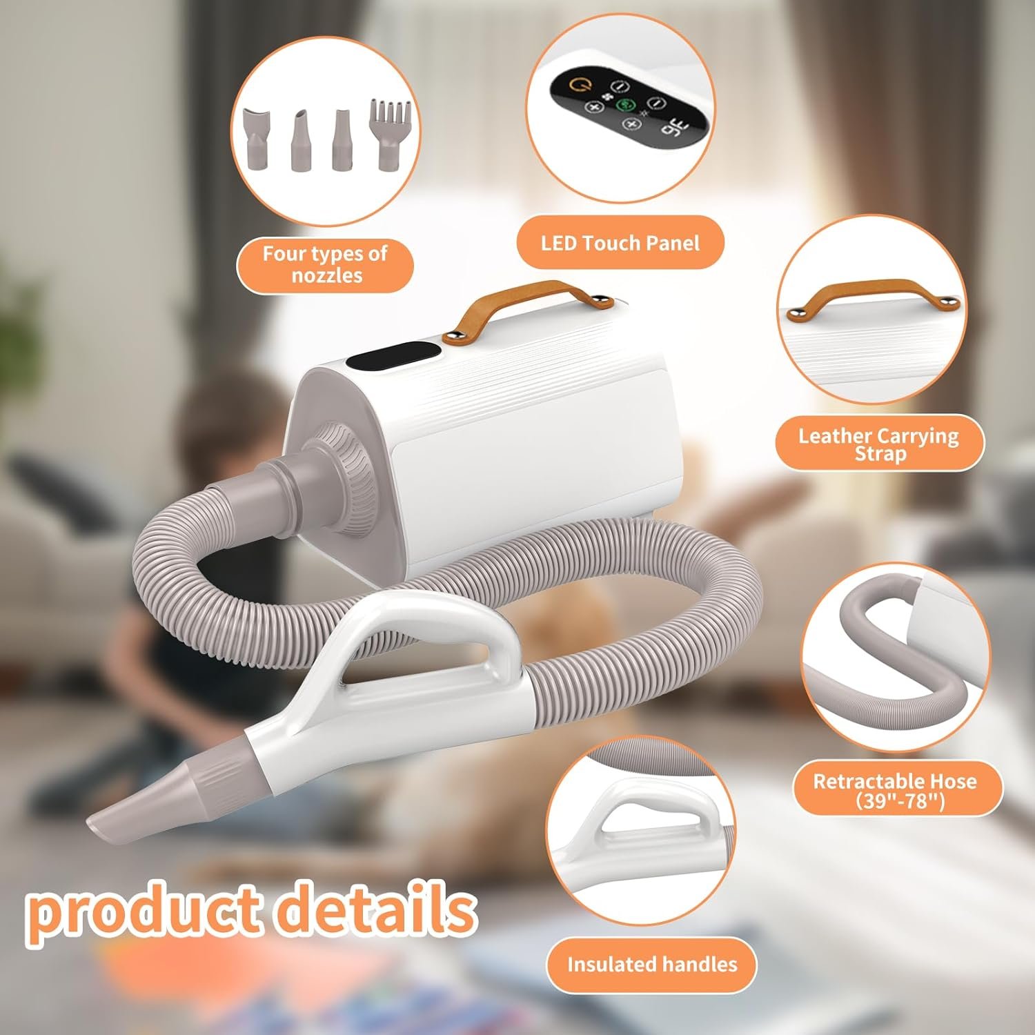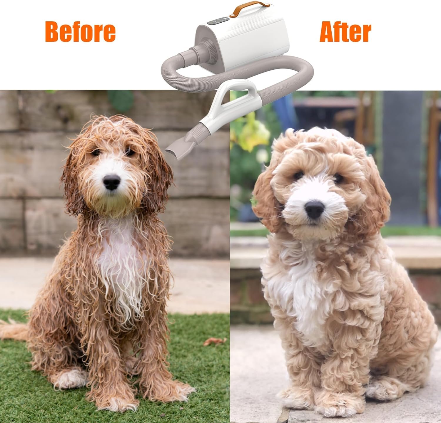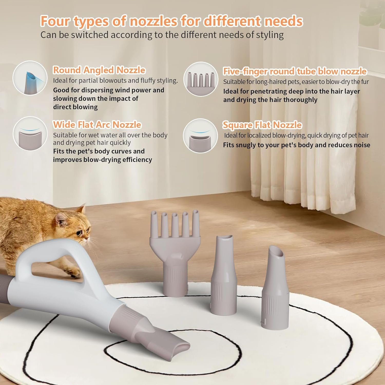 🐕〖4 Nozzle Designs and Flexible Hose〗PawSailor Dog Grooming Dryer comes with 4 professional-quality styling nozzles that can be switched at will for all breeds of dogs, even kittens, depending on the styling needs. The flexible hose extends up to 39 feet, which ensures more unrestricted and free movement as you dry your pet.