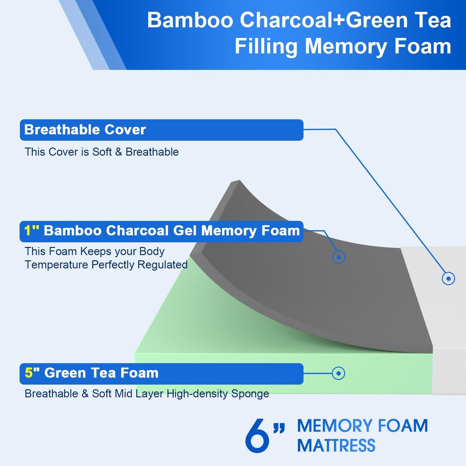 Our mattress is a perfect combination of comfort and innovation.The upper layer is 1 inch bamboo charcoal gel, which can keep the fresh smell. The lower layer is 4/5 inch green tea support foam. The unique combination of bamboo charcoal and green tea injected into the memory cotton layer is designed for quiet night sleep.