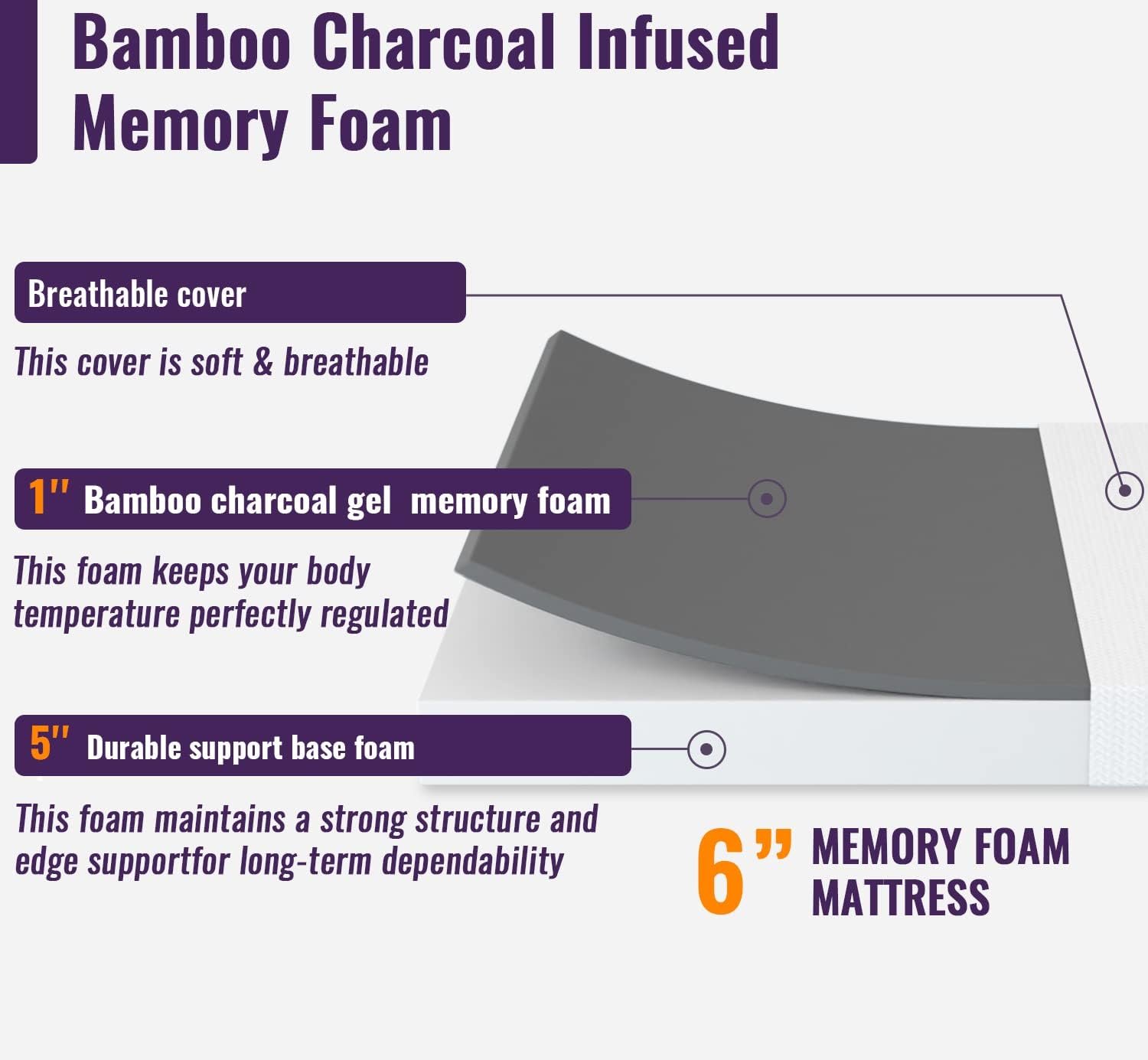 【Bamboo charcoal filled memory foam】: Our memory cotton mattress is filled with a proper amount of bamboo charcoal powder, and the high-quality bamboo charcoal soaking solution ensures a clean feeling every night. This gel infused mattress will keep you cool and actively regulate the temperature throughout the night. Our mattress is designed for safety, durability, performance, emissions and content, which will bring you a different sleep experience.