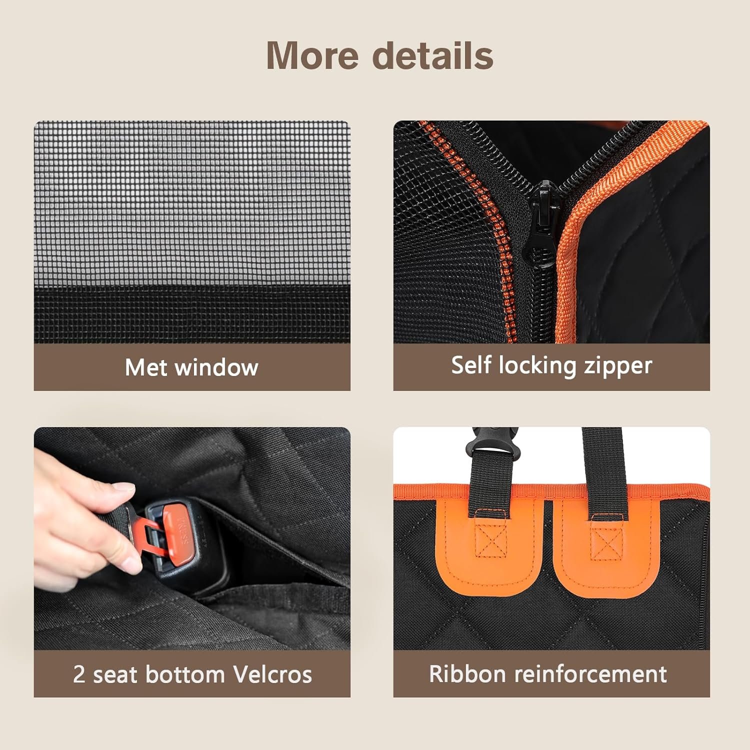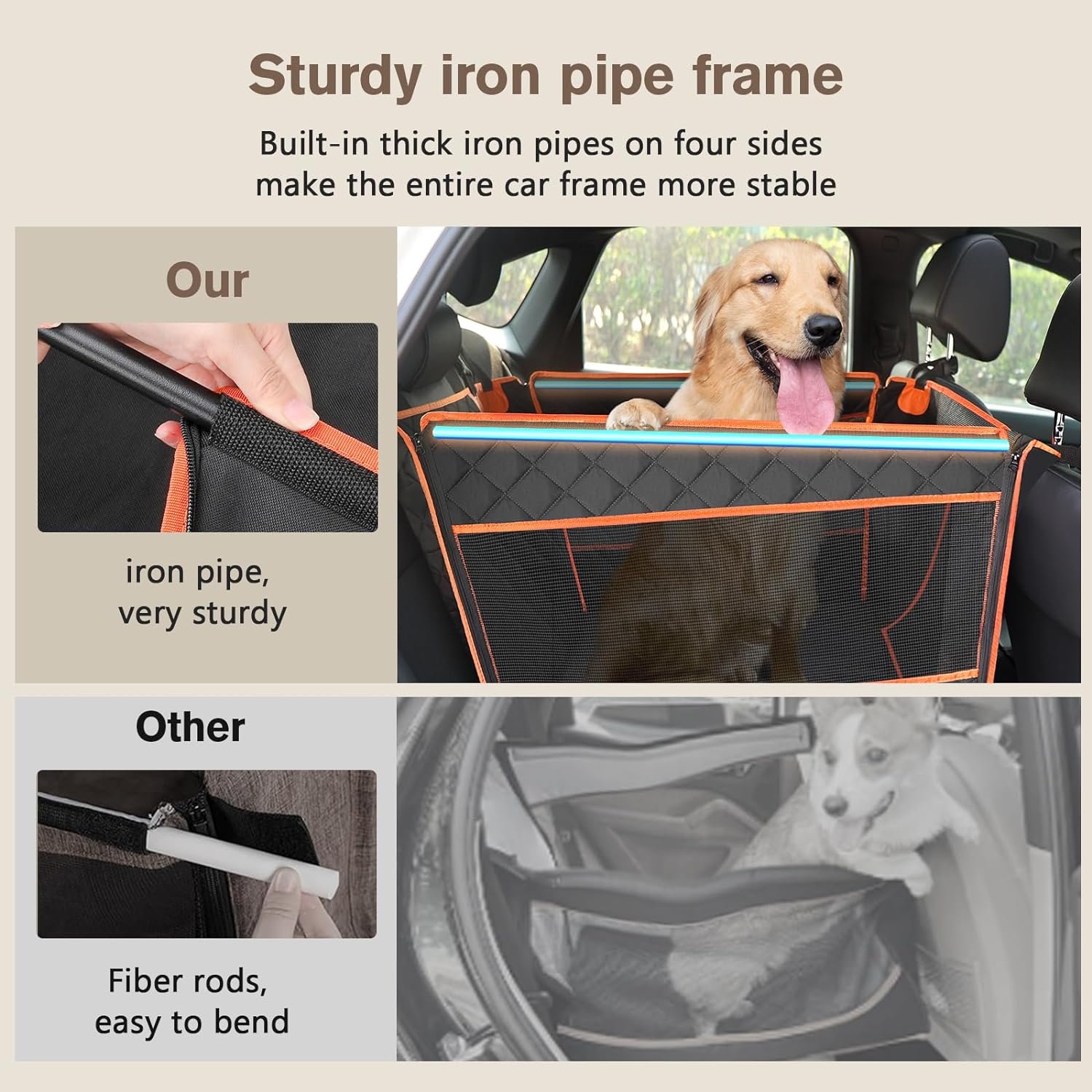 🐾【Easy Installation】Our dog car seat only takes a few steps. First, connect the two sections of pipes respectively. Second, insert the pipes into the four sides of the car seat. Third, after entering the car, insert the anti-skid plugs on both sides. Fourth, install the straps to the front and rear head restraints and tighten. Last, Zip up all four sides.