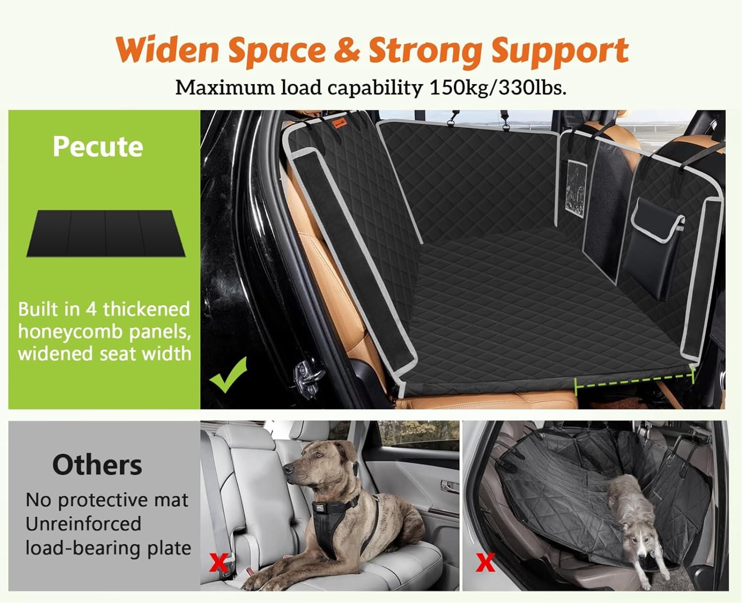 🐾【Spacious and Supportive Dog Car Bed】 The dog car seat cover has 4 sturdy honeyboard plates that expand the backseat into a wide and cozy bed for dogs. It can hold up to 330 lbs, providing plenty of room and strong support for dogs of all sizes to rest and unwind on long car journeys.