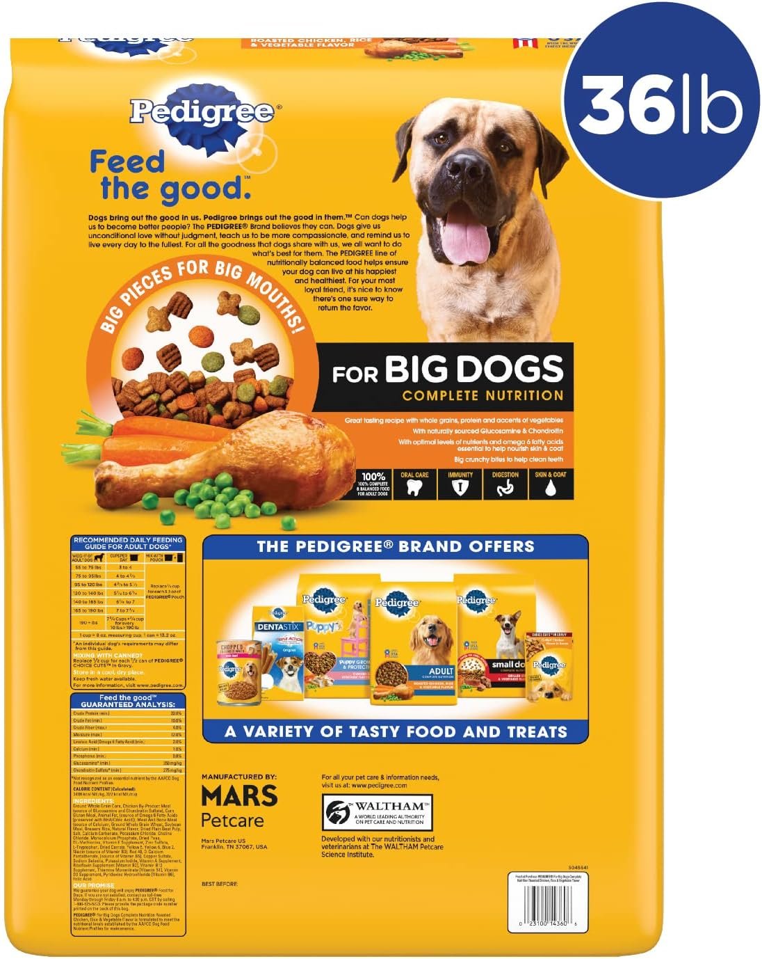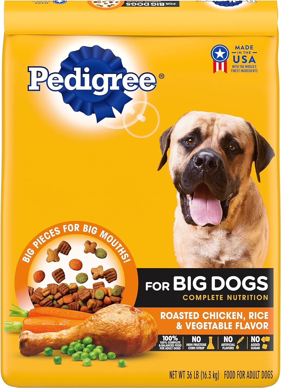Contains one (1) PEDIGREE For Big Dogs Adult Complete Nutrition Large Breed Dry Dog Food Roasted Chicken, Rice & Vegetable Flavor Dog Kibble, 36 lb. Bag