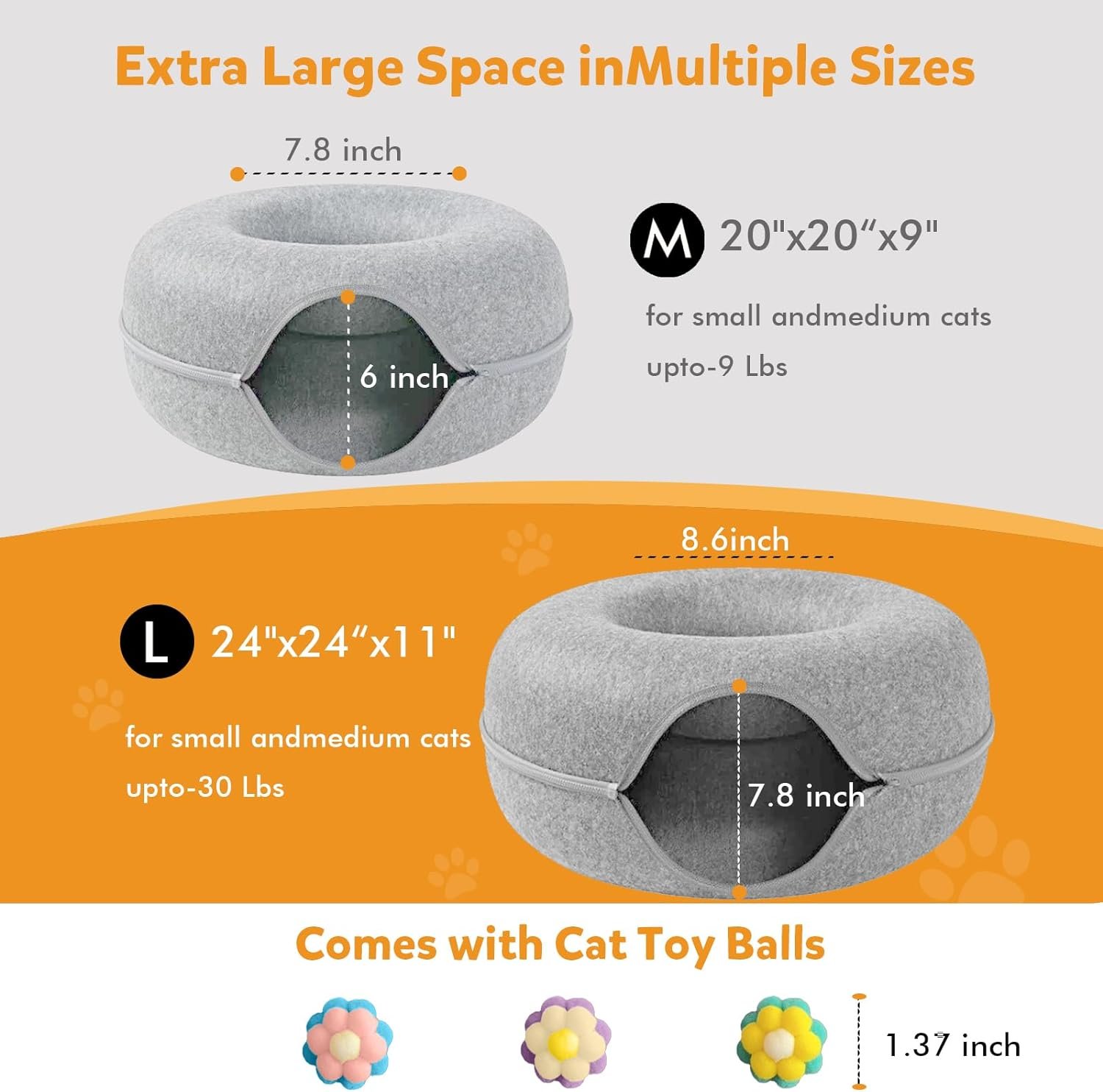 [Size Description] Cat Donut tunnel bed large: 24 inches * 24 inches * 11 inches, suitable for cats weighing up to 22 pounds; medium: 20 inches * 20 inches * 8 inches, suitable for cats weighing up to 7 pounds. Both sizes come with 3 kitten toys. This cat tunnel bed is definitely a great gift for cats, we always pursue high quality products and the most perfect service, if there is any problem with the product, just click “Contact Us”, we will be happy to solve the problem for you.