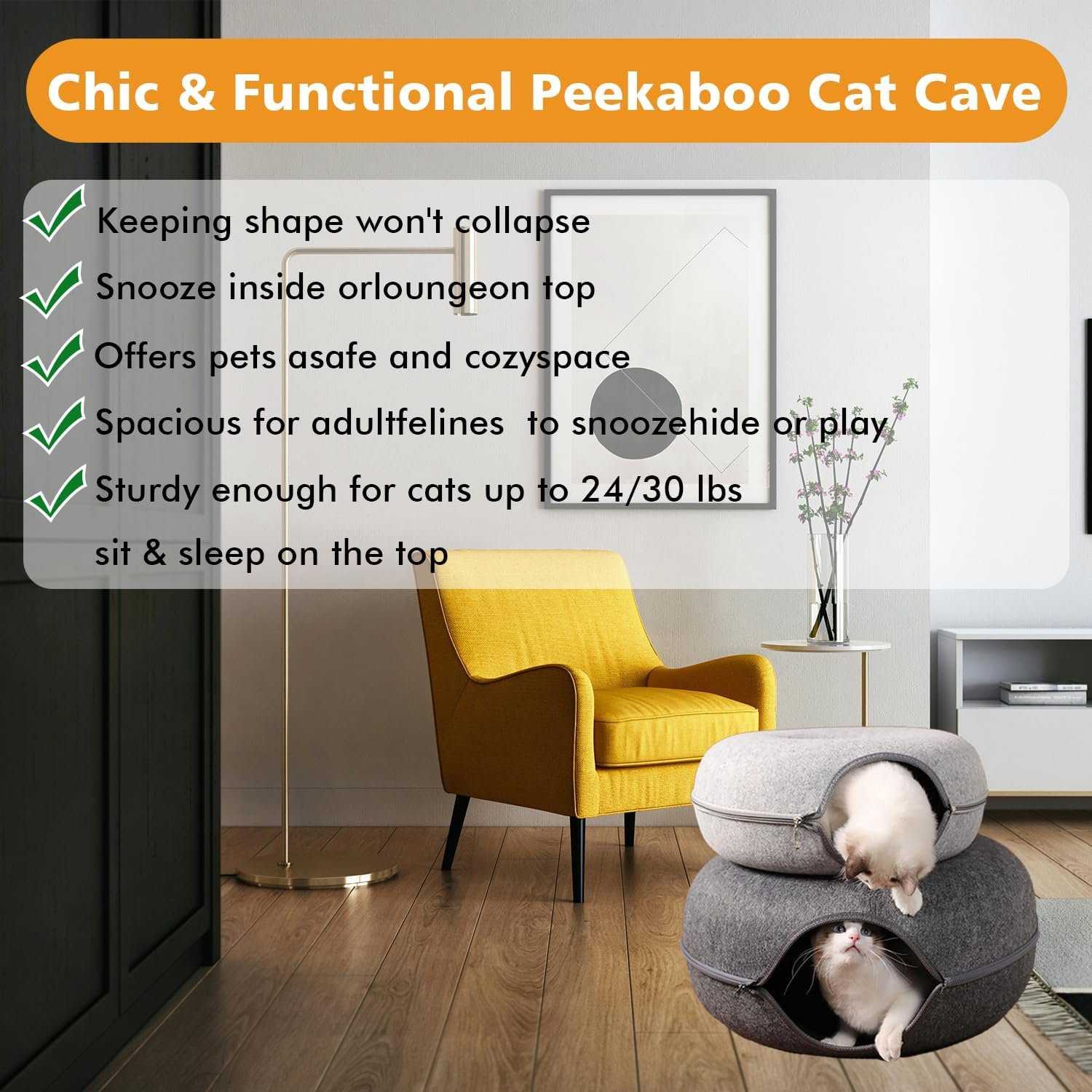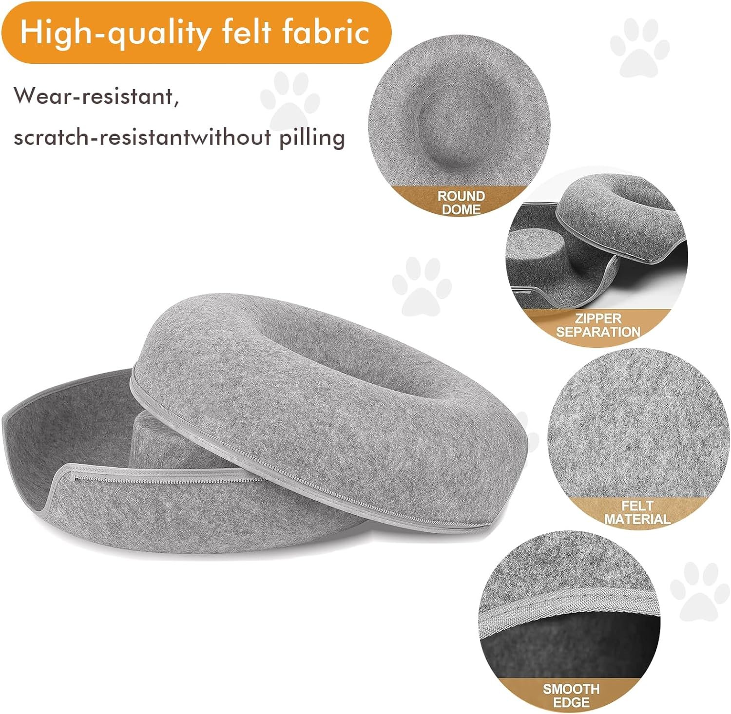 [Dual-Purpose] The peekaboo cat cave adopts Double-layer composite donut/circle design,Dual-Purpose cat bed, No Collapse. donut bed on top and a tunnel bed below,This unique combination provides interactive play and cozy sleep for your cats. Cats can either play in the tunnels or rest and sleep on top! perfect for multiple cats, do not disturb each other. It’s the ultimate all-in-one cat bed for your feline friends.