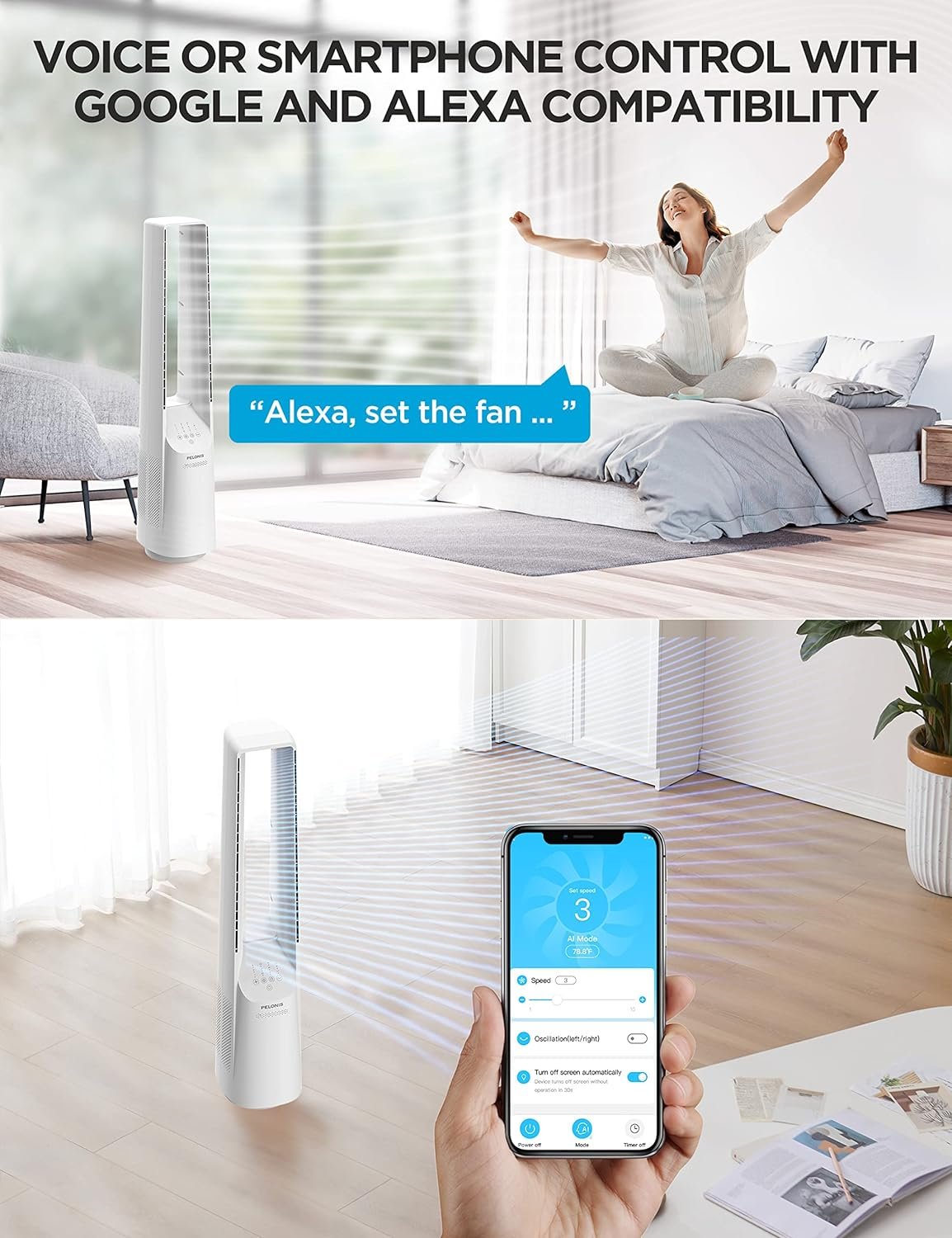 Smart and Adaptive Comfort: Our fan isn’t just about powerful airflow, it’s about smart airflow. It adjusts its speed based on the room’s temperature, ensuring you stay comfortable no matter the weather. Plus, with compatibility for wireless control with Google and Alexa, you can control your fan with just your voice or your smartphone. )