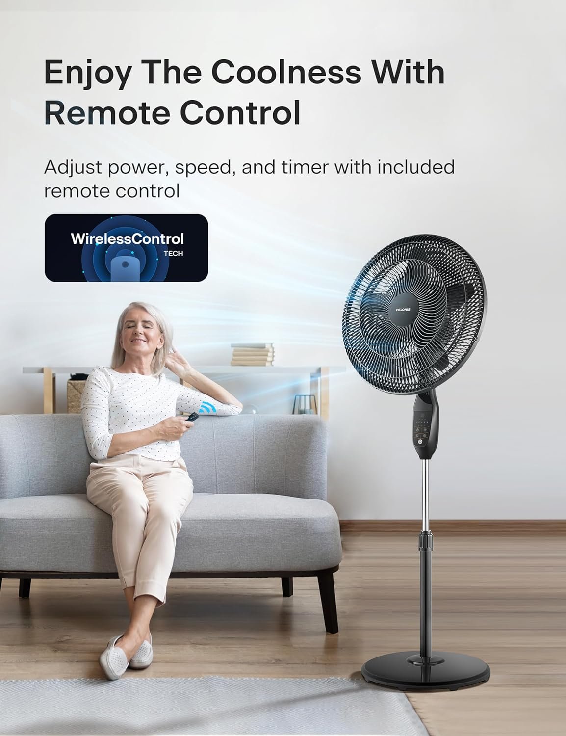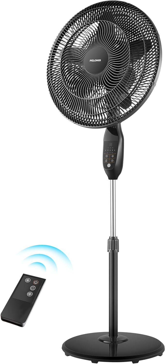 This PELONIS Pedestal Fan is equipped with a powerful motor and high-quality 5 blades. It has an Intelligent Auto-Eco Temperature Control function and 7-hour timer with Auto Shut-off. Equipped with 4 modes, 5 speed settings, an easy to read LED display and remote contoller. The 85° oscillation angle and 24° tilt angle and the height of the fan can be adjusted between 3.9 to 4.7 feet for maximum convenience.