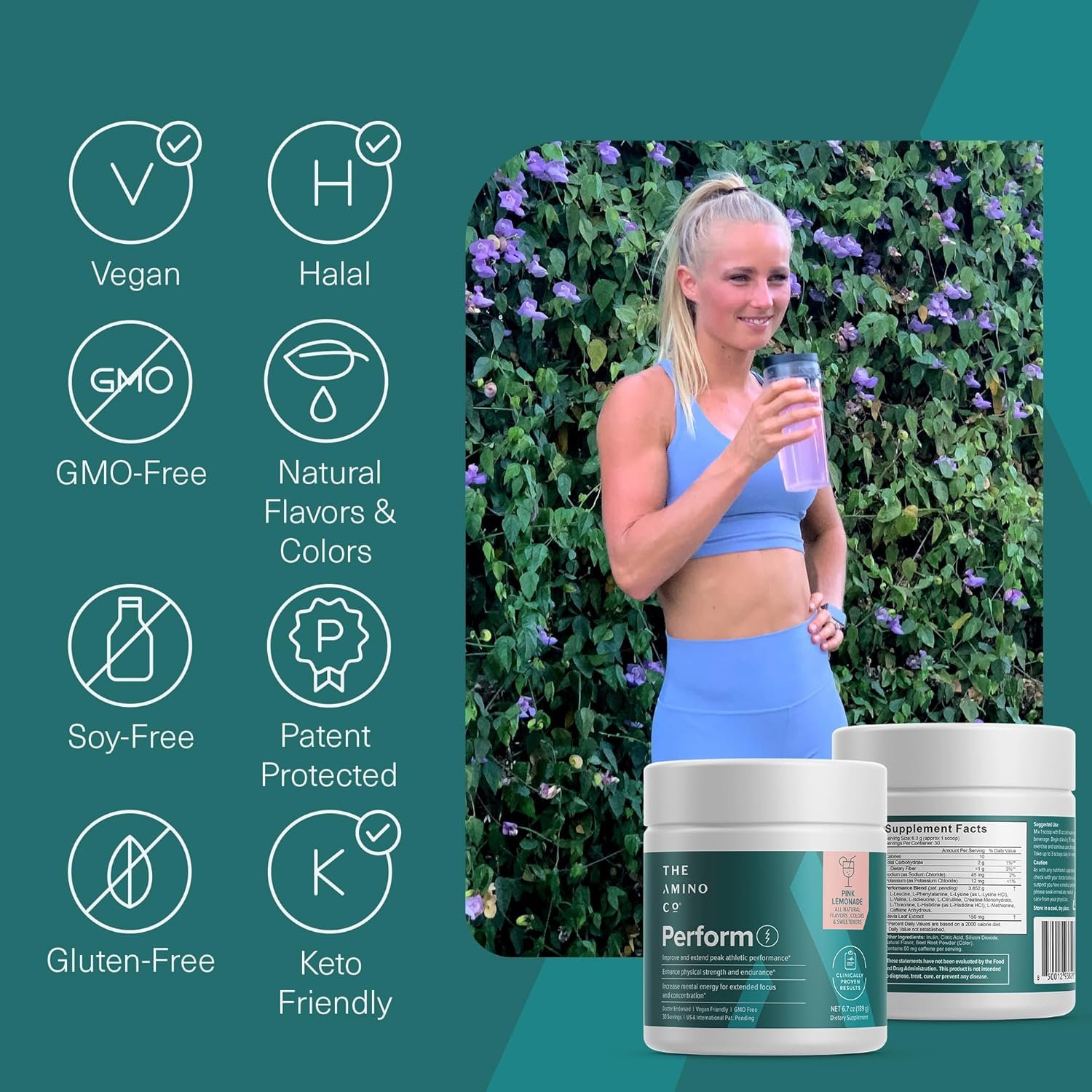 Effective Performance Boost: Amino CO Perform Pink Lemonade healthy pre workout, a potent amino acid nutritional supplement. Vegan, soy-free, gluten-free, halal, and keto-friendly. Patented blends, natural colors, and stevia for a healthy, delicious choice.