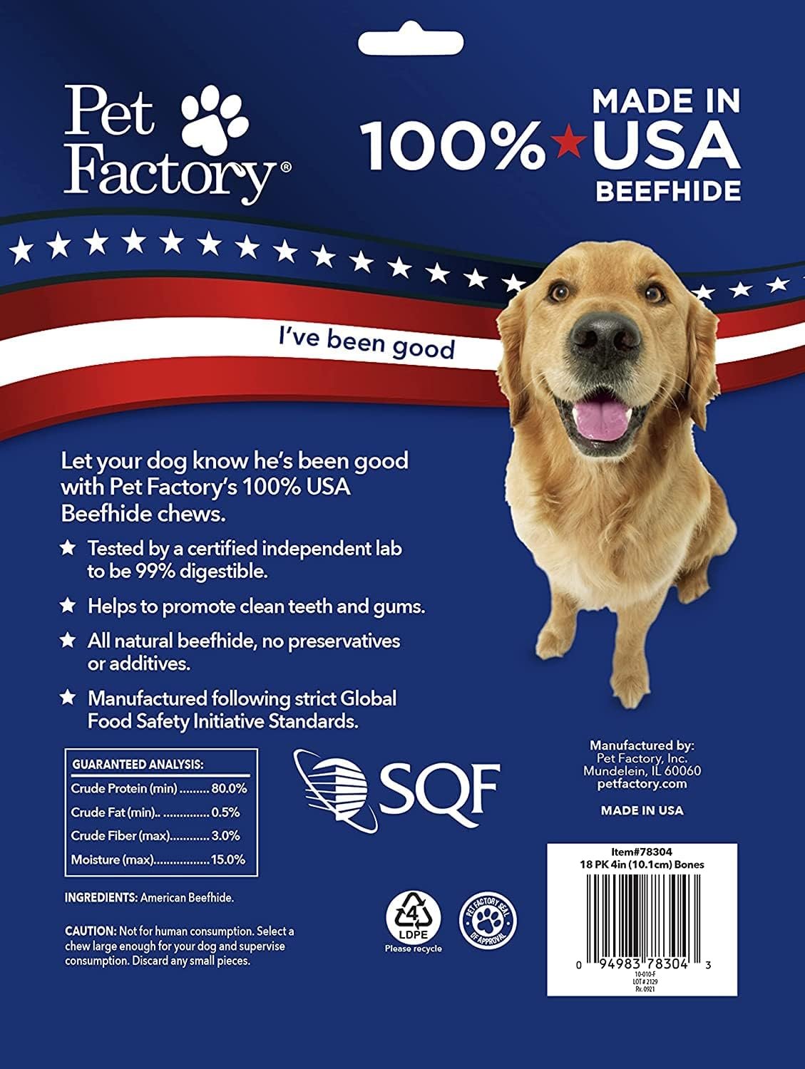 FOOD SAFETY: Pet Factory beefhide chews are made in our Global Food Safety Initiative-certified manufacturing facility, which gives customers peace of mind in knowing that our products are produced under optimum safety and quality conditions