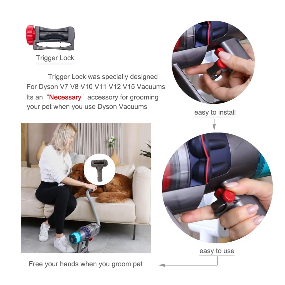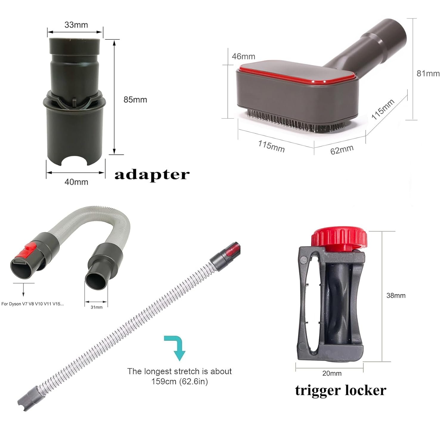 【DOG PET HAIR BRUSH ATTACHMENT FOR VACUUM FOR DYSON】The hose and grooming tool works perfectly together, can extends up to 62.6inches ,can be flexed as you need to reach every angle, edge, and corner. The groom tool kit features a trigger lock,Free your hand and fingers,you can avoid the discomfort of constantly pressing the on button when cleaning your pet’s hair
