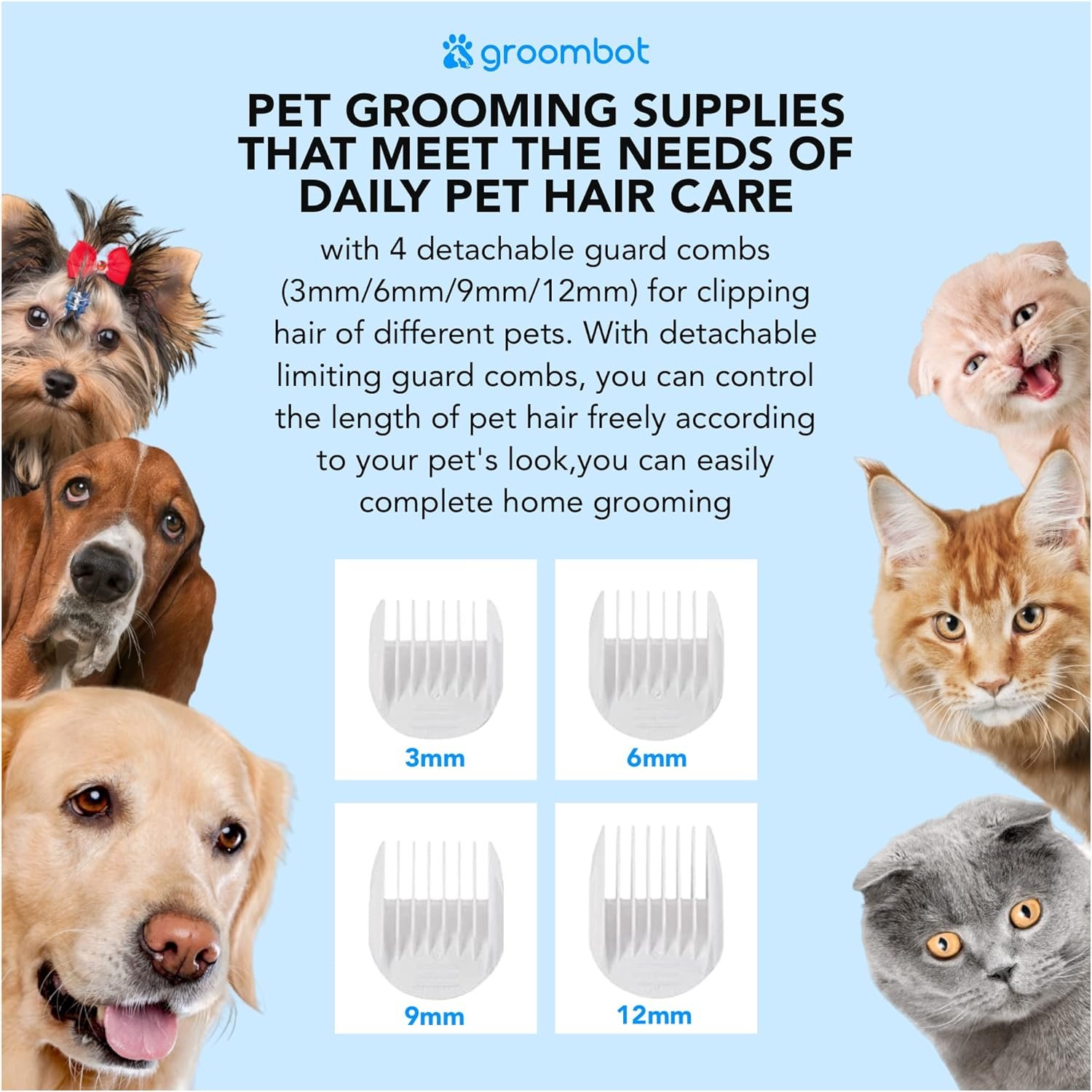🐕【All-In-One Professional Grooming at Home】GroomBot’s 5-in1 pet grooming kit & vacuum includes hair clippers that are perfect for trimming and shaping your pet’s fur, while the deshedding brush and grooming brush help to remove loose hair and prevent matting. The nozzle head allows you to easily vacuum pet hair from hard-to-reach areas, while the cleaning brush is ideal removing pet hair from your clothes and furniture. Even includes 4 detachable hair clipper guard combs.