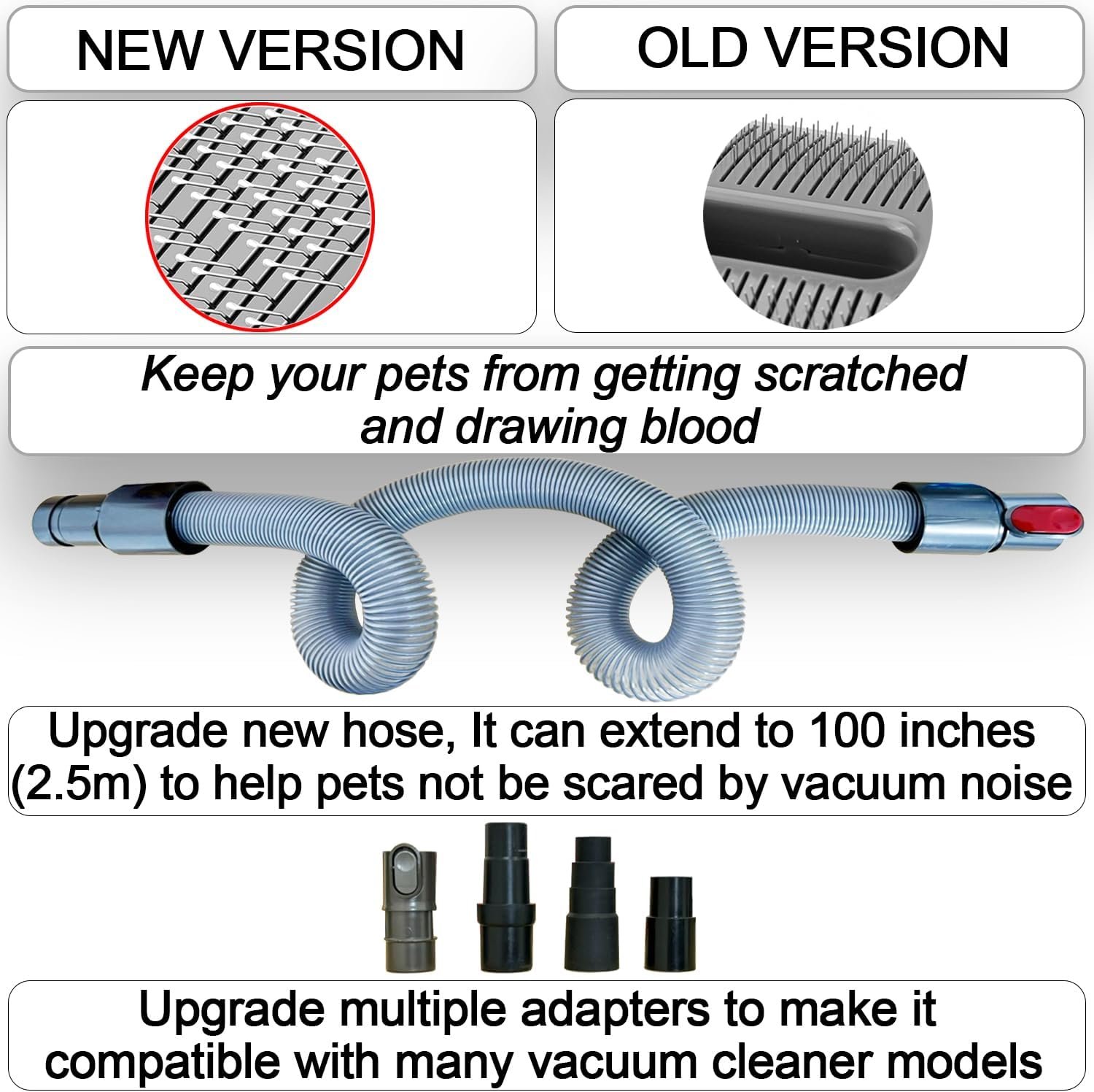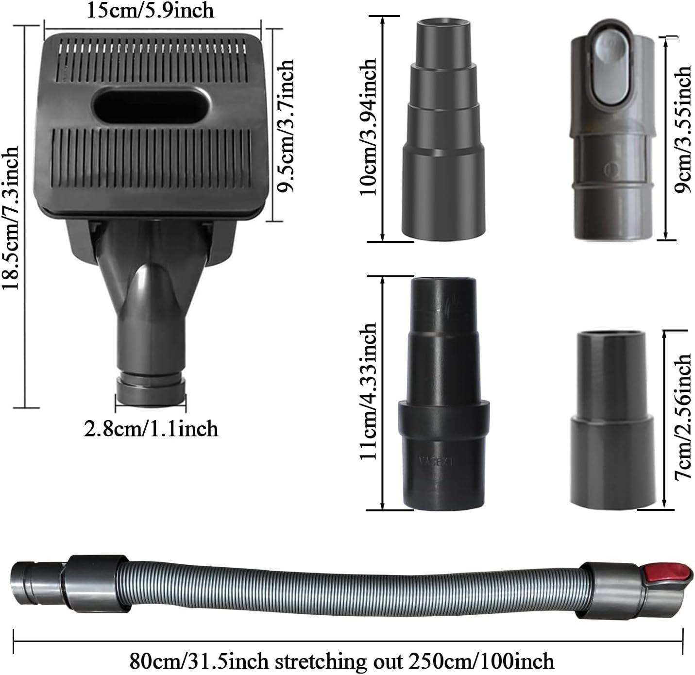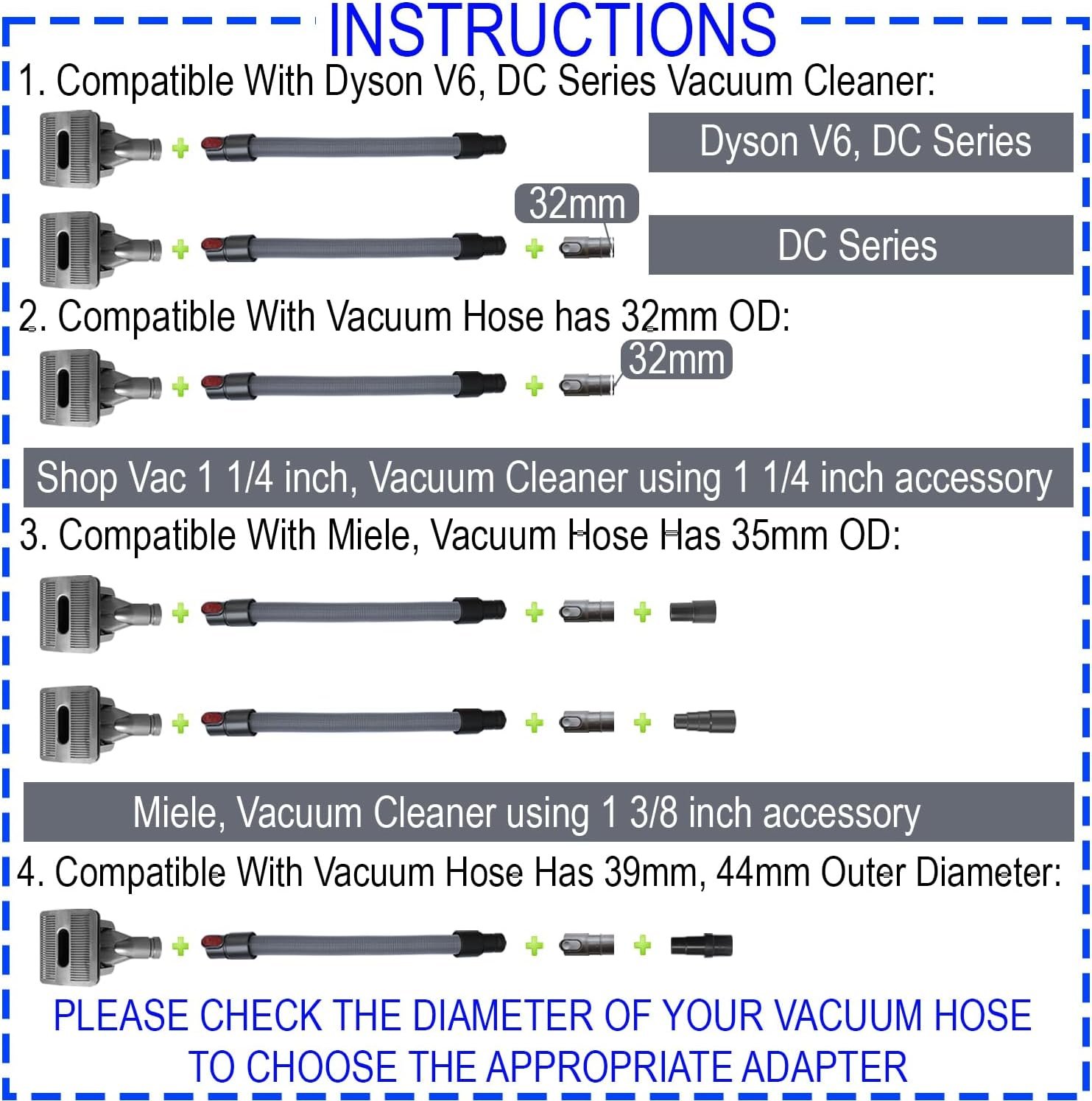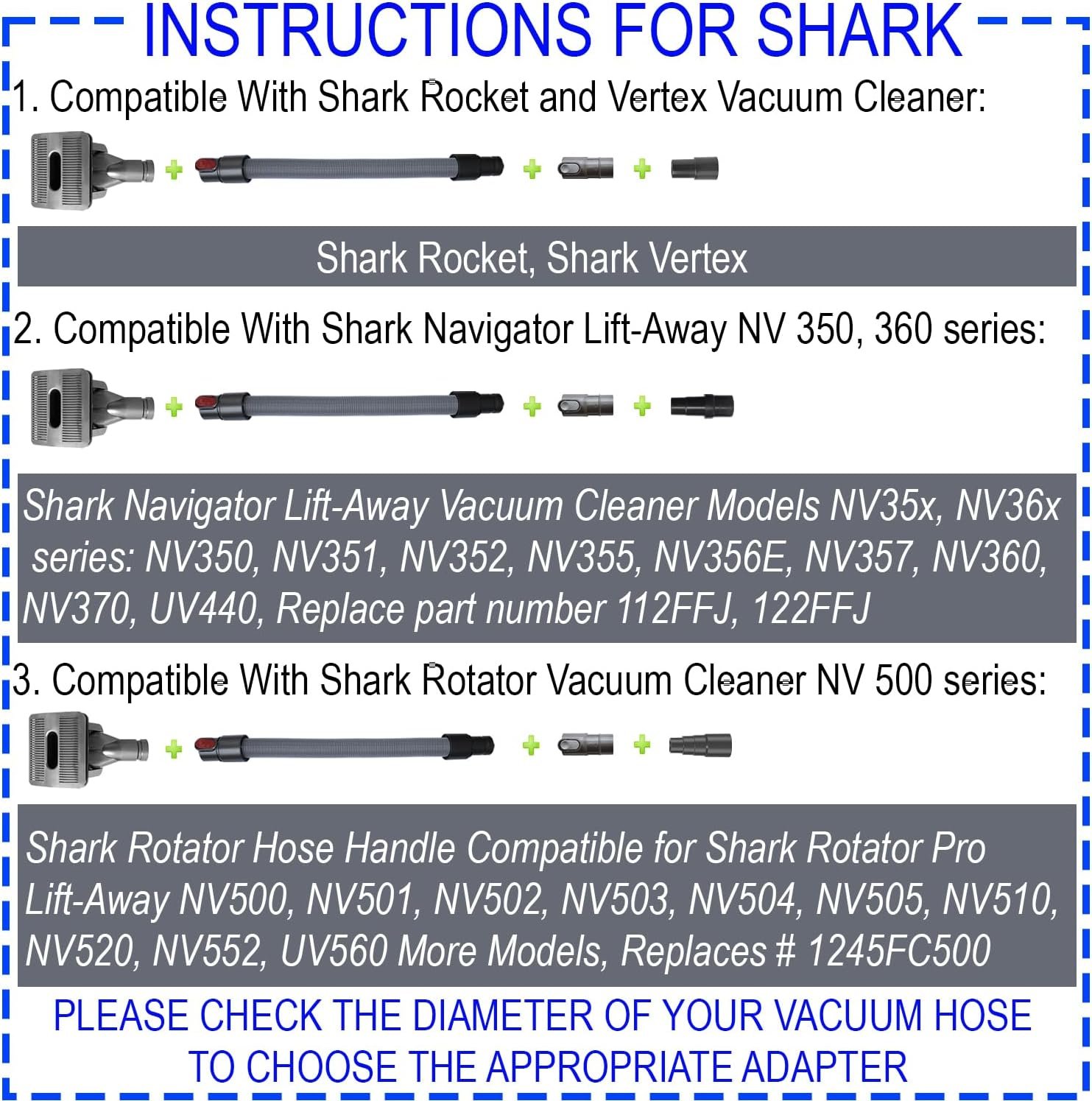 Wide Compatibility: Equipped with an Adapter Kit, this Pet Grooming Brush Kit is compatible with Miele Shark Rocket HV300 HV301 Shark Navigator NV350 NV360 Shark Rotator NV500 Dyson V6 DC series small Shop vac and various vacuum cleaners using 1-1/4inch (32MM) or 1-3/8inch (35MM) accessories.