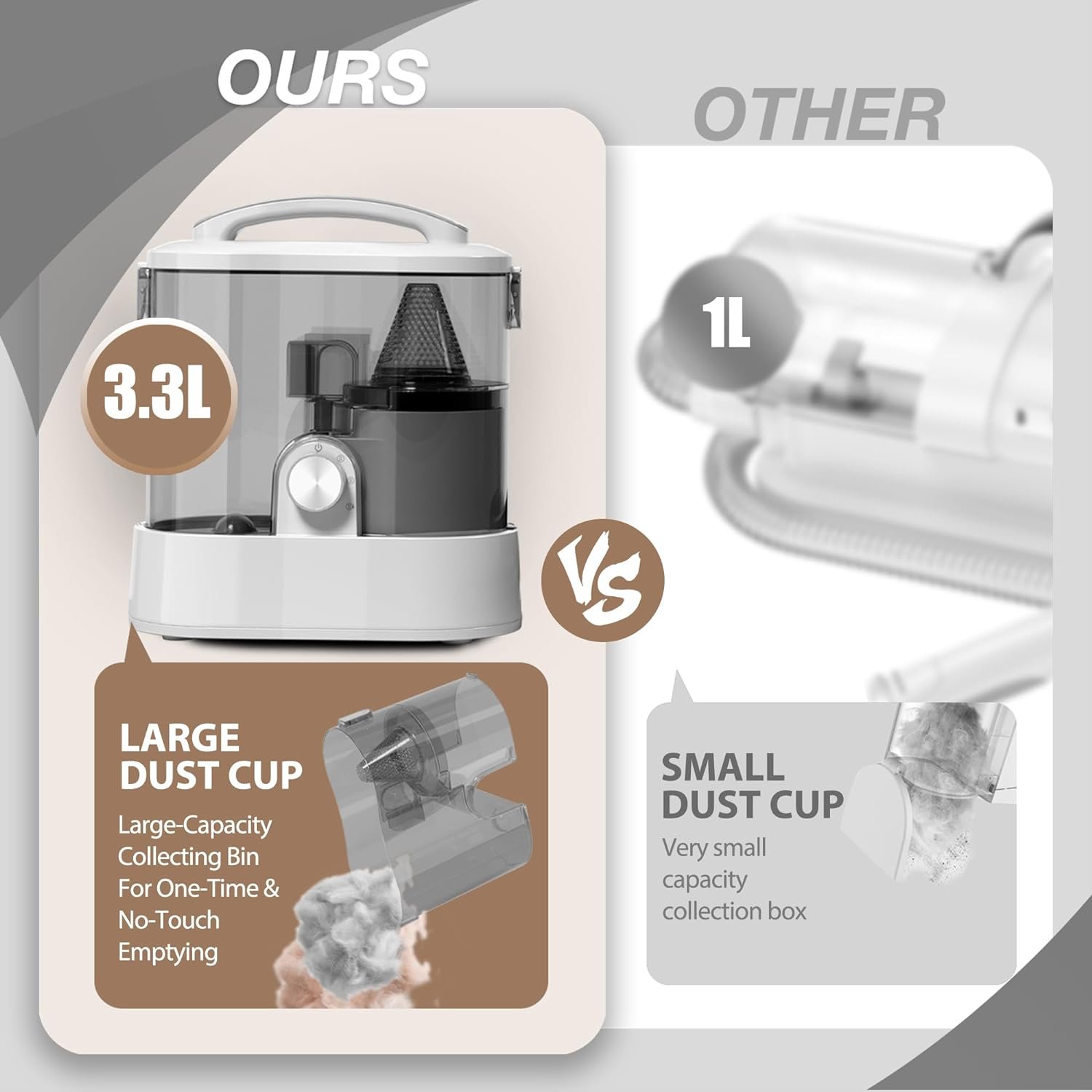 3.3L LARGE CAPACITY DUST BOX AND DRYER HAIR: The supersized 3.3L dust cup can contain shavings from up to 3 dogs per use, efficient vacuum system with 3 adjustable suction speeds of the biggest 14kPa, either choose the low suction for trimming and de-shedding or high suction for thorough deep cleaning.