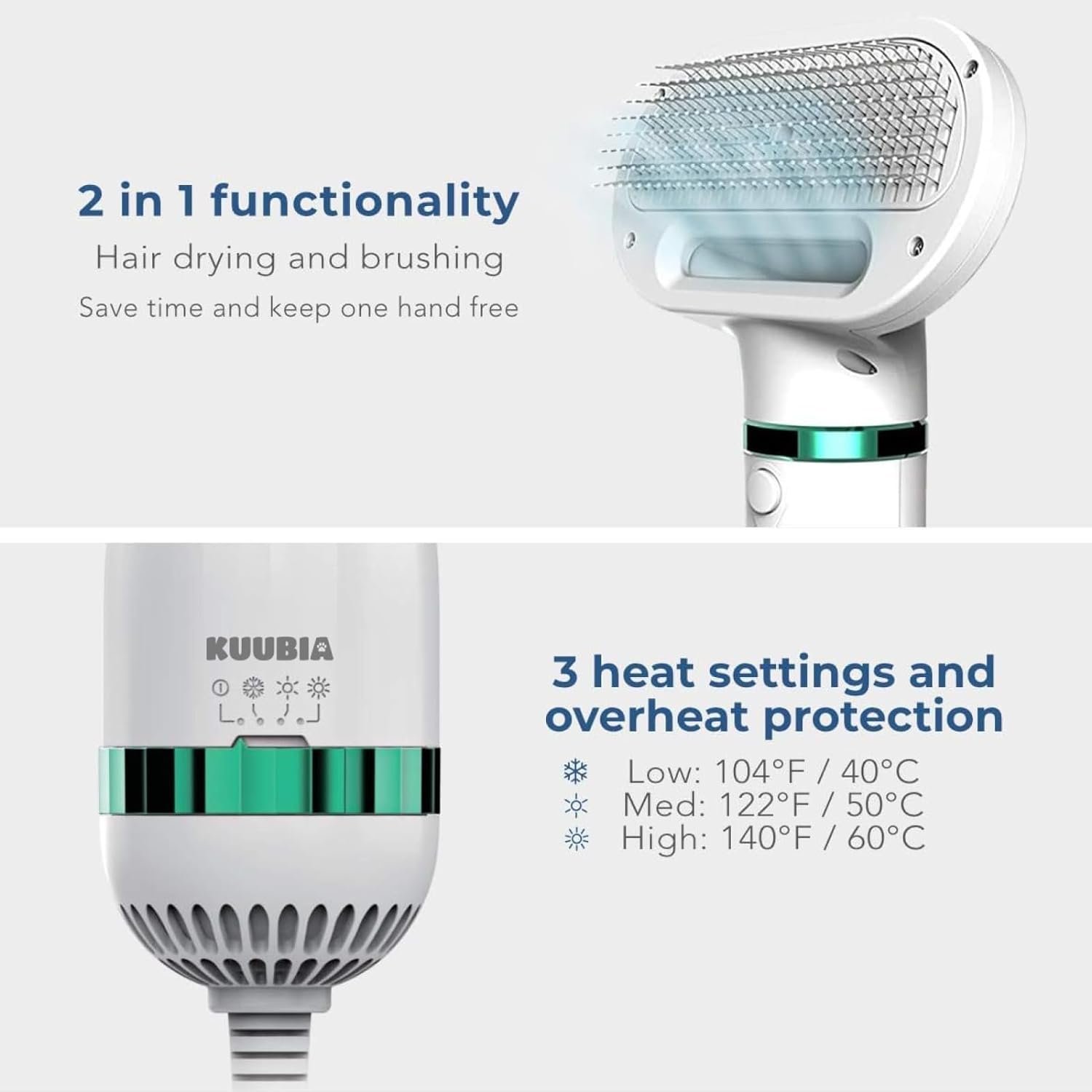 【Dryer & Brush in One】This versatile 2-in-1 pet grooming dryer is the perfect solution for drying your pet with gentle care. Ideal after a bath, a walk in the rain, or on chilly winter days, this combined dryer and brush offers warmth and comfort to your dog. With one smooth motion, you can simultaneously brush and dry your pet.