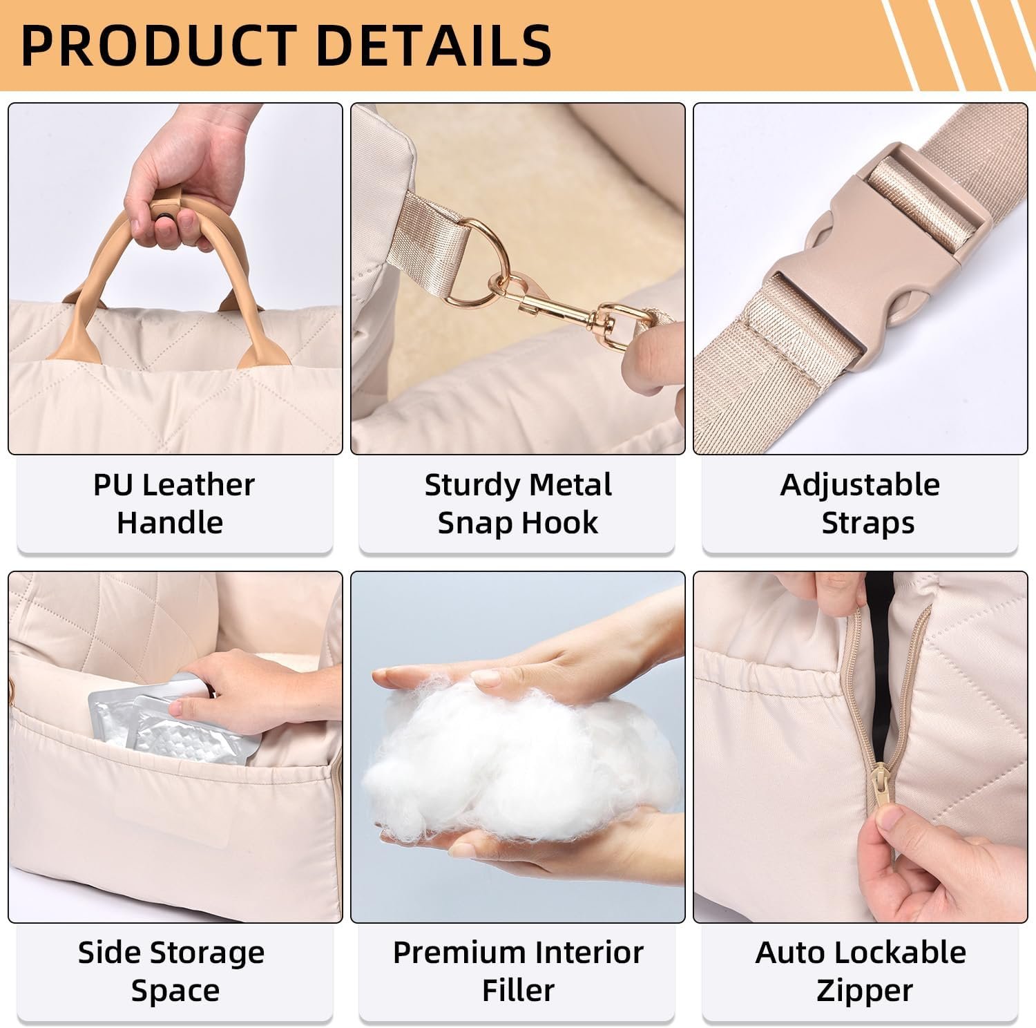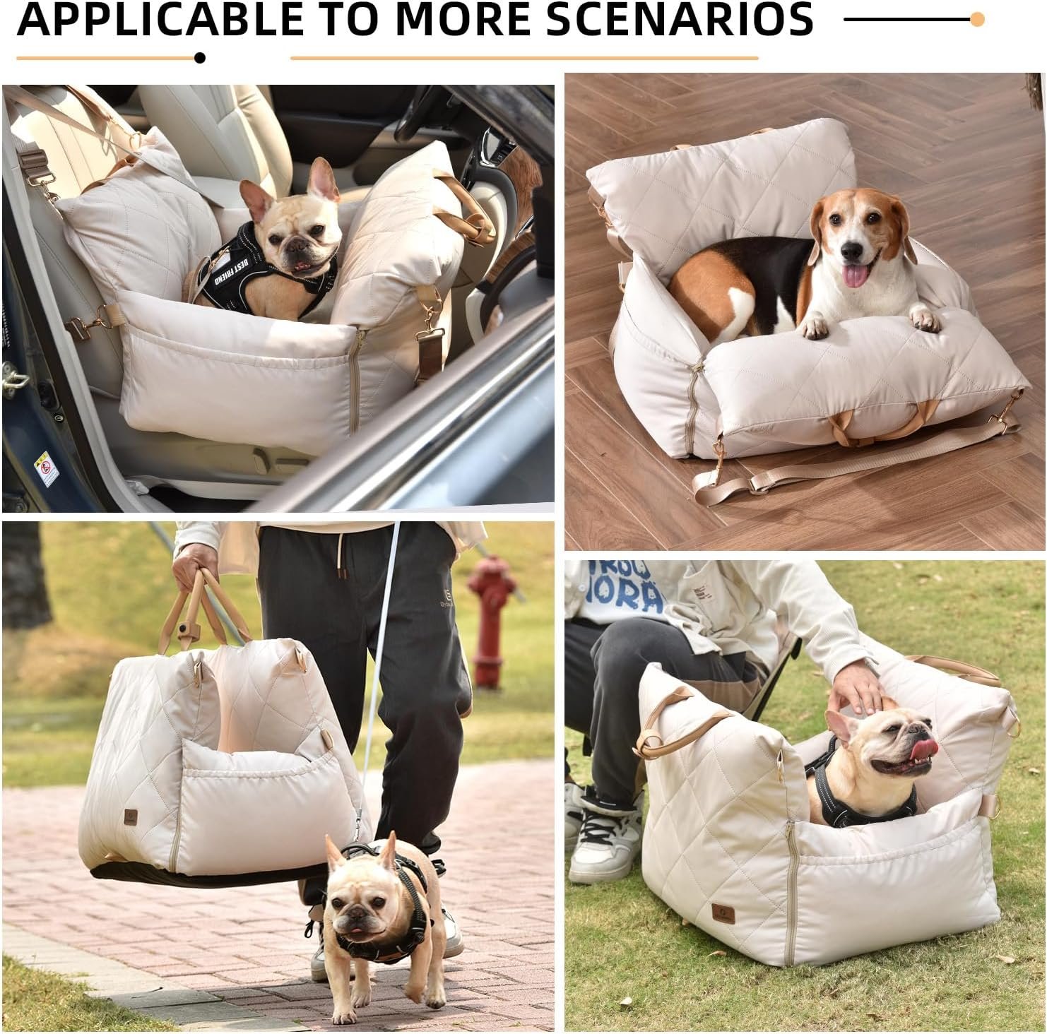 Thoughtfully Designed Details: We use sturdy safety belts and metal buckles to prevent the straps from breaking; the seams are strong quilting stitches, which are not prone to separation; the bottom material is non-slip and colorfast, ensuring the vehicle stays clean and your pet safe; the PU material handle is both durable and stylish; and the large-capacity storage pockets on both sides meet the needs for daily outings.