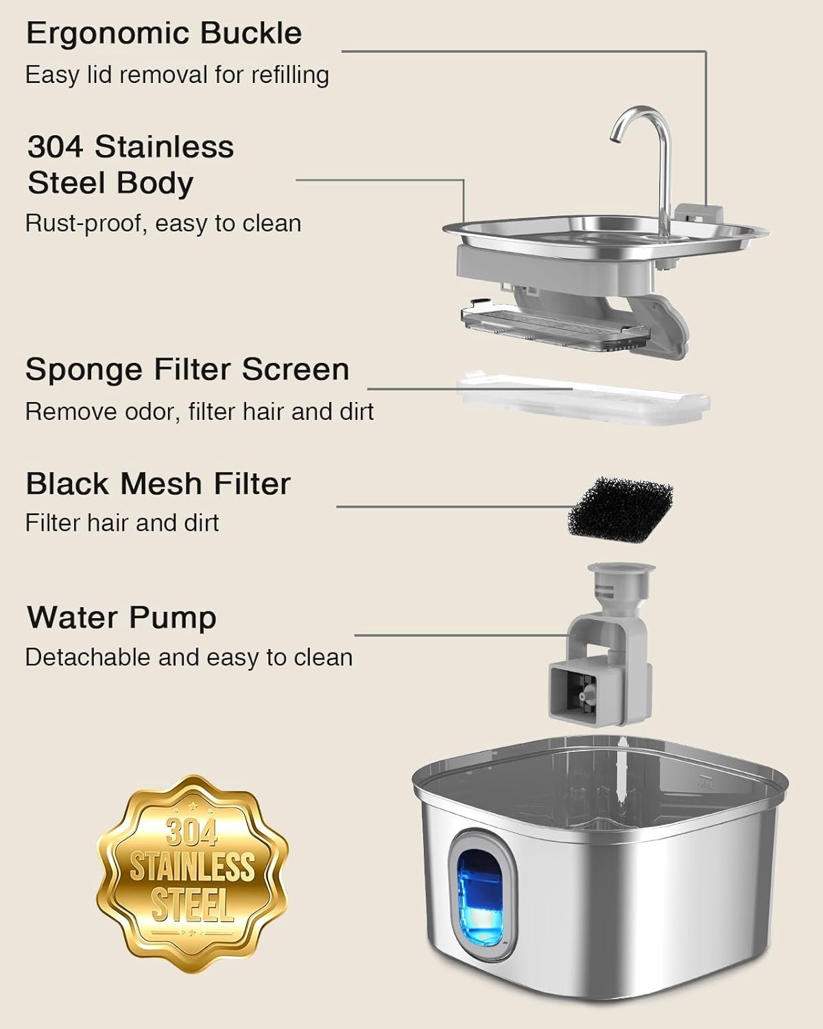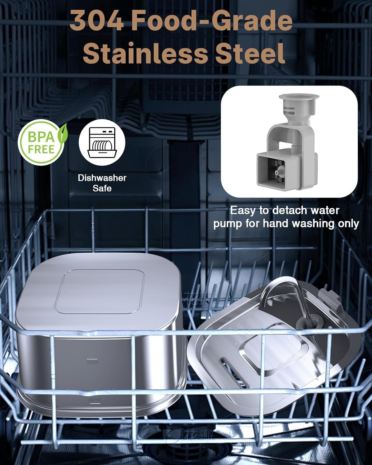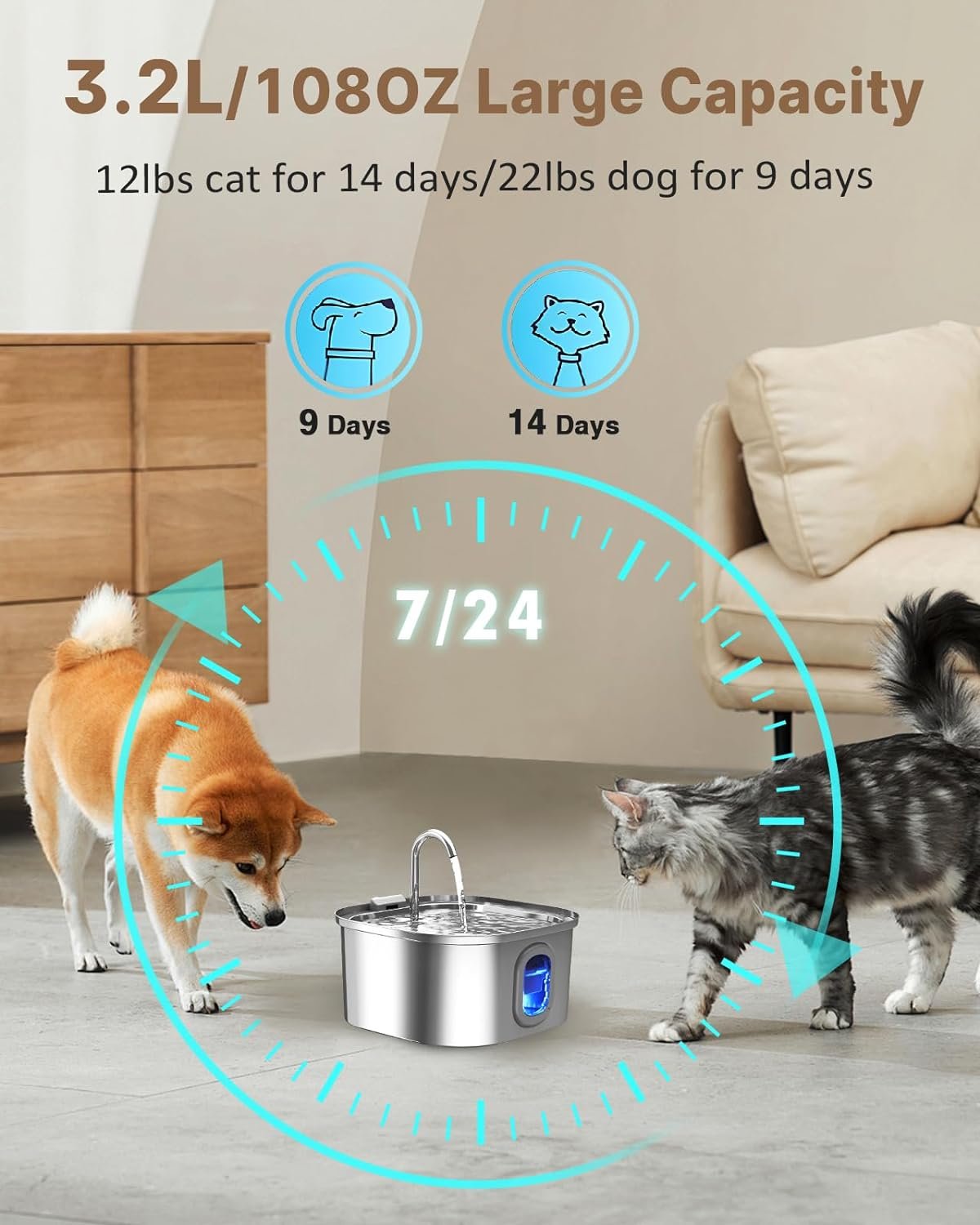 😽【108oz/3.2L Capacity & Premium Stainless Steel】: Our cat water fountain is crafted from 304 stainless steel, which is safer and more durable than plastic alternatives. Resistant to scratches and corrosion, it excels in maintaining a hygienic environment for your pet. With a generous capacity of 108oz/3.2L, this automatic water dispenser can last up to 14 days for a 12-pound cat or 9 days for a 22-pound dog, reducing the need for frequent refilling.
