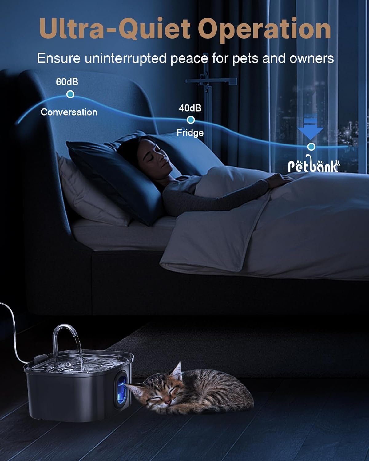 😽【Ultra-Qieut Operation】: Operating at a noise level lower than 40dB, this fountain water bowl offers stress-free hydration, creating an undisturbed environment for both pets and owners.