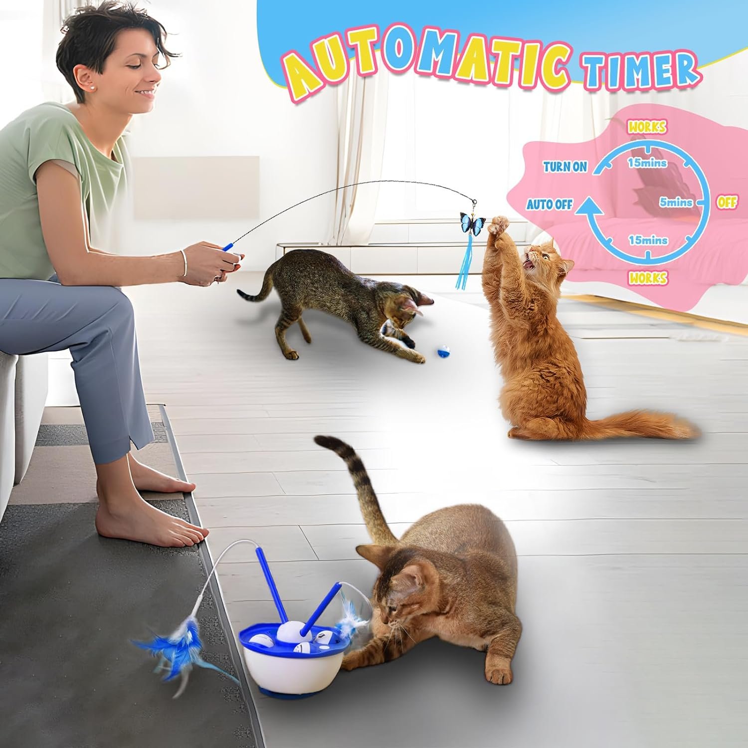 [Smart Cat Toy Box] Research suggests that adult cats need 15-30 minutes of exercise each day, and too much or too little activity can impact their health. Our cat toy is designed to work 15 minutes, automatically stop for 5 minutes (allowing cats to recharge), and then resume for another 15 minutes. It ensures cats get ample exercise while having a blast.