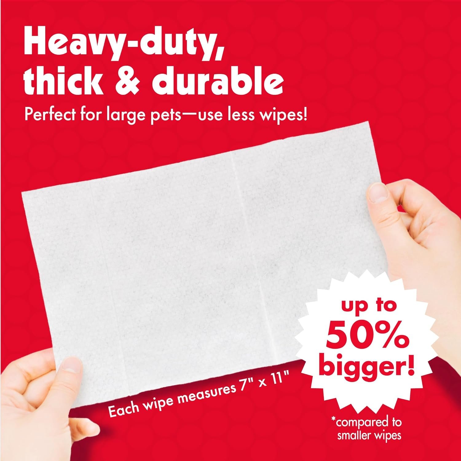 Use Less Wipes – The 7 x 11 inch Big n’ Thick wipes are larger than standard wipes, making them the smart choice for large pets and helps reduce how many wipes you need to use. Moistened with a gentle cleaning formula, and enriched with a soothing aloe to keep your pet’s coat soft, shiny and smelling great.