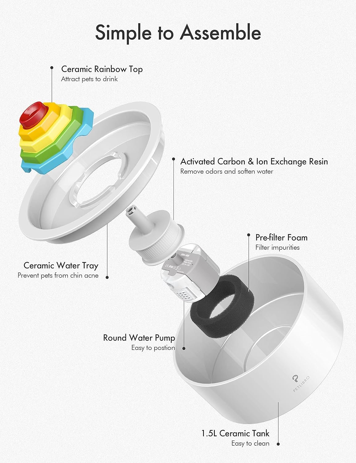 Quadruple Filtration: PETLIBRO pet water fountain uses the quadruple filtration technique to ensure your pet always drinks clean water. The coconut shell-activated carbon removes bad tastes and odors, and ion exchange resin softens the water to prevent the build-up of limescale.