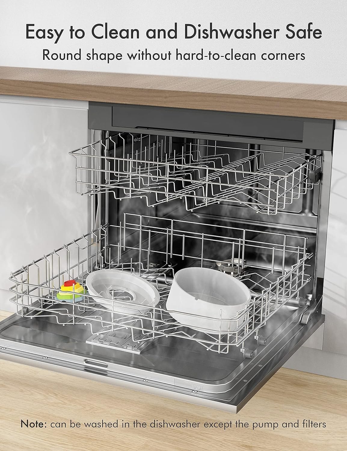 Easy to Clean & Dishwasher Safe: The whole ceramic cat water dispenser is detachable and washable, the smooth surface and round shape make it really easy to clean without hard-to-clean nooks and crannies. The pet fountain can be washed in the dishwasher except for the pump and filters. It’s recommended to replace the filter and clean the pump every 2 weeks.