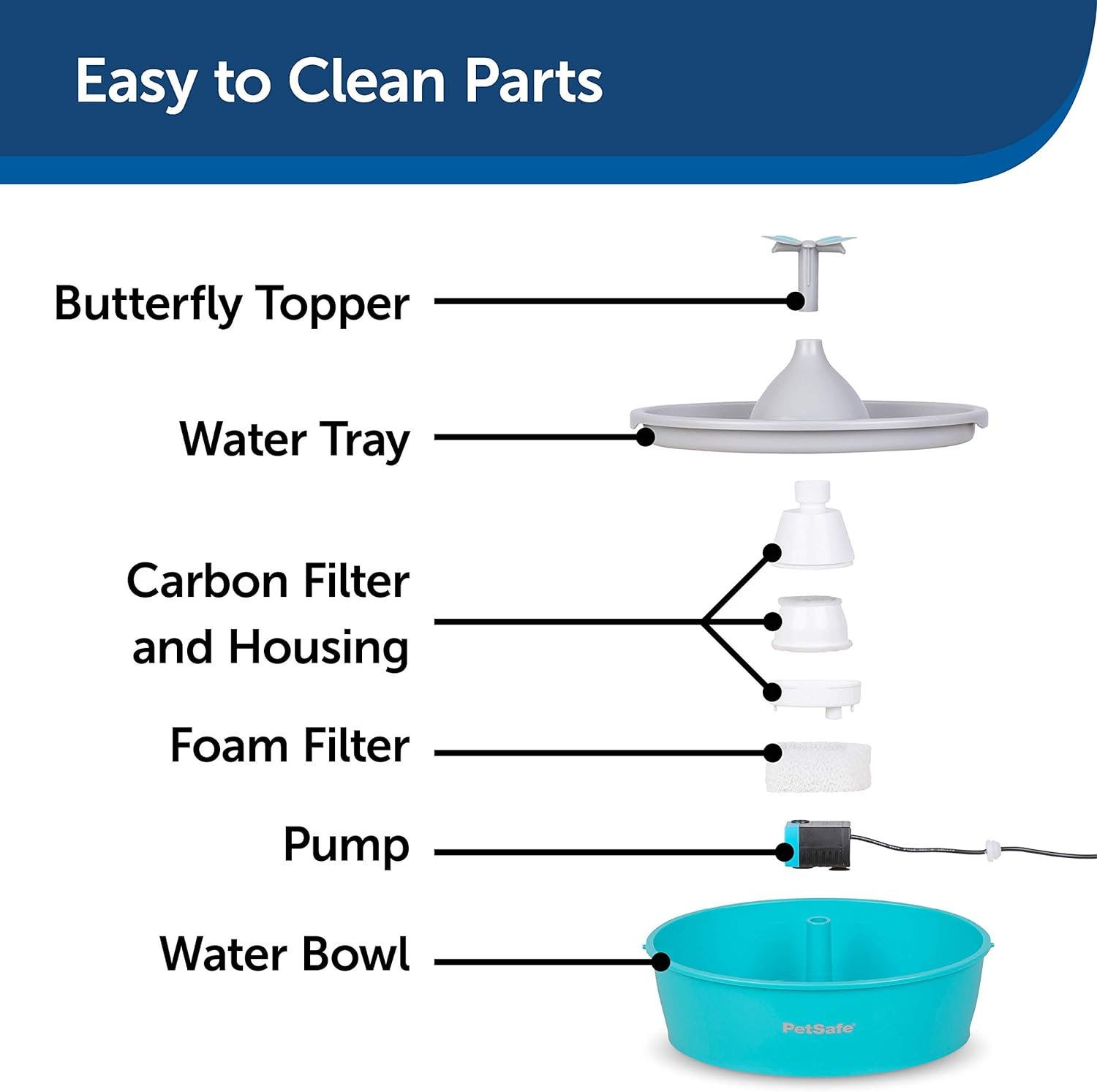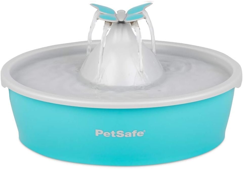 Give your furry friend fresh, flowing water with the PetSafe Drinkwell Butterfly Pet Fountain. A constant stream of water attracts dogs and cats to the water fountain, encouraging them to drink and keeping them hydrated. A removeable butterfly topper adds a fun decorative element to your pet fountain and creates 4 free-falling water streams from which your pet can drink. The topper can easily be removed to create a quiet, bubbling water flow. A carbon filter and foam filter work together to remove pet hair, debris and bad tastes from your best friend’s water. This BPA-free plastic fountain is specifically designed to have no hard-to-reach places when it’s time to clean your pet’s water bowl. PetSafe brand is here to help you and your pet to LIVE HAPPY TOGETHER.