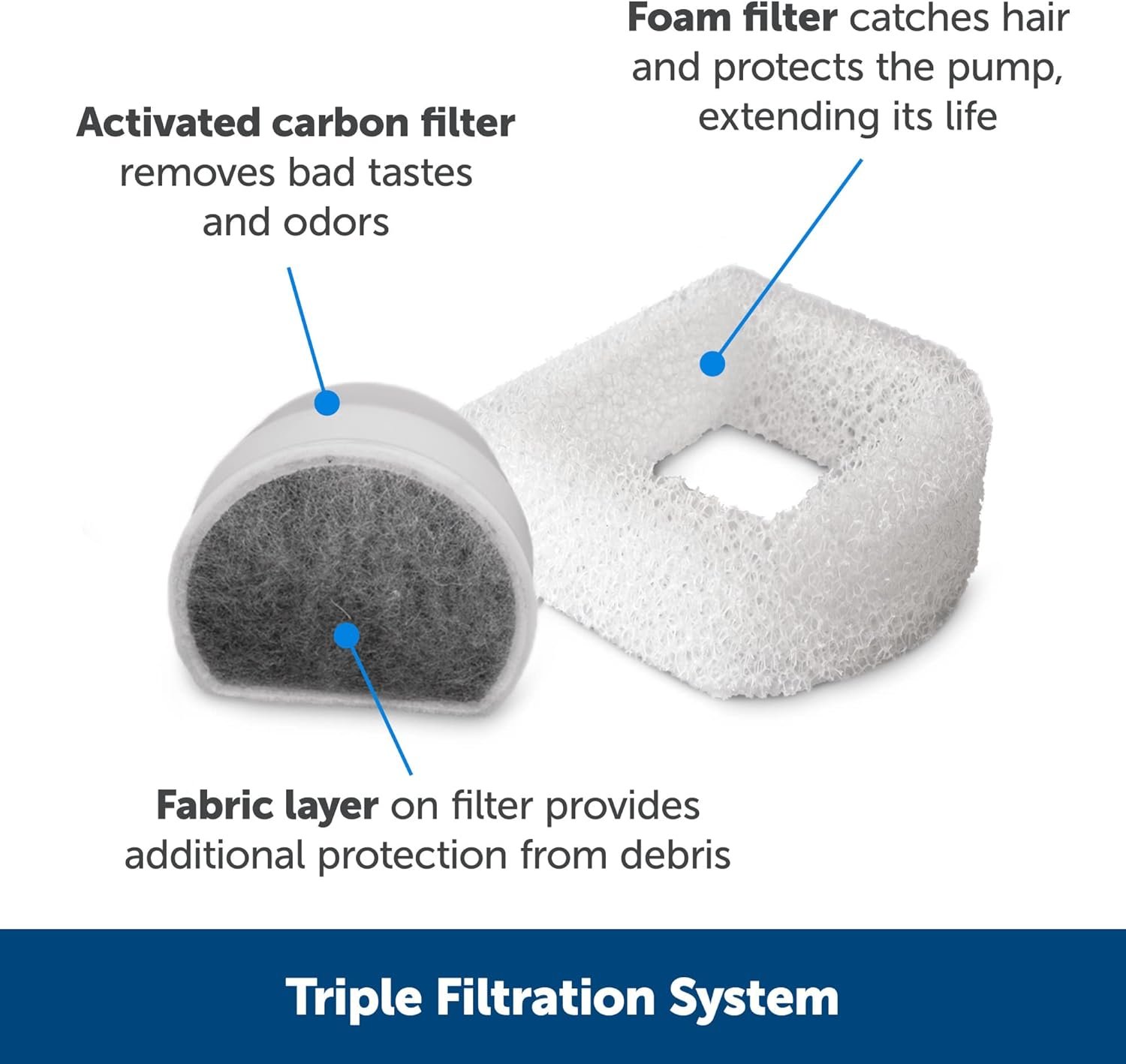 FRESH, FLOWING WATER: Replaceable carbon filter refreshes water and the foam filter catches pet hair and debris to keep your cat’s water clean