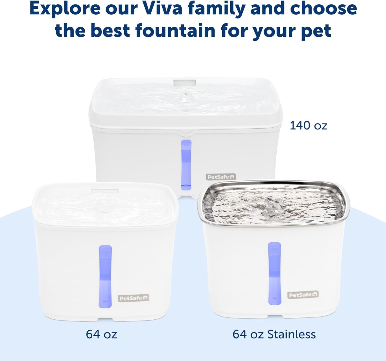 Give your cat a fountain theyll fall in love with at first sip with Viva Pet Fountain! This cat fountain keeps water fresh and flowing all the time, so your kitty will drink more water every day. The dual filtration keeps water tasting great and looking even cleaner, providing an experience traditional pet bowls just cant. It isnt just an upgrade for your cat pet parents can say goodbye to the daily chore of filling and cleaning their pets drinking bowl! Help your pet stay healthy and happy with this 64 oz. Viva Pet Fountain.