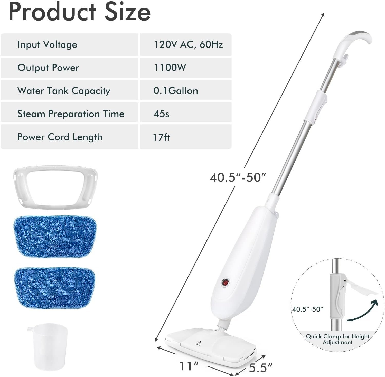 Extendable Handle Pole: The height of steam mop is adjustable in the range of 40.5″-50″. Considering better using experience, the steam mop comes with an ergonomic handle to ensure comfortable grip. When not in use, the handle pole also can be removed for easy storage.