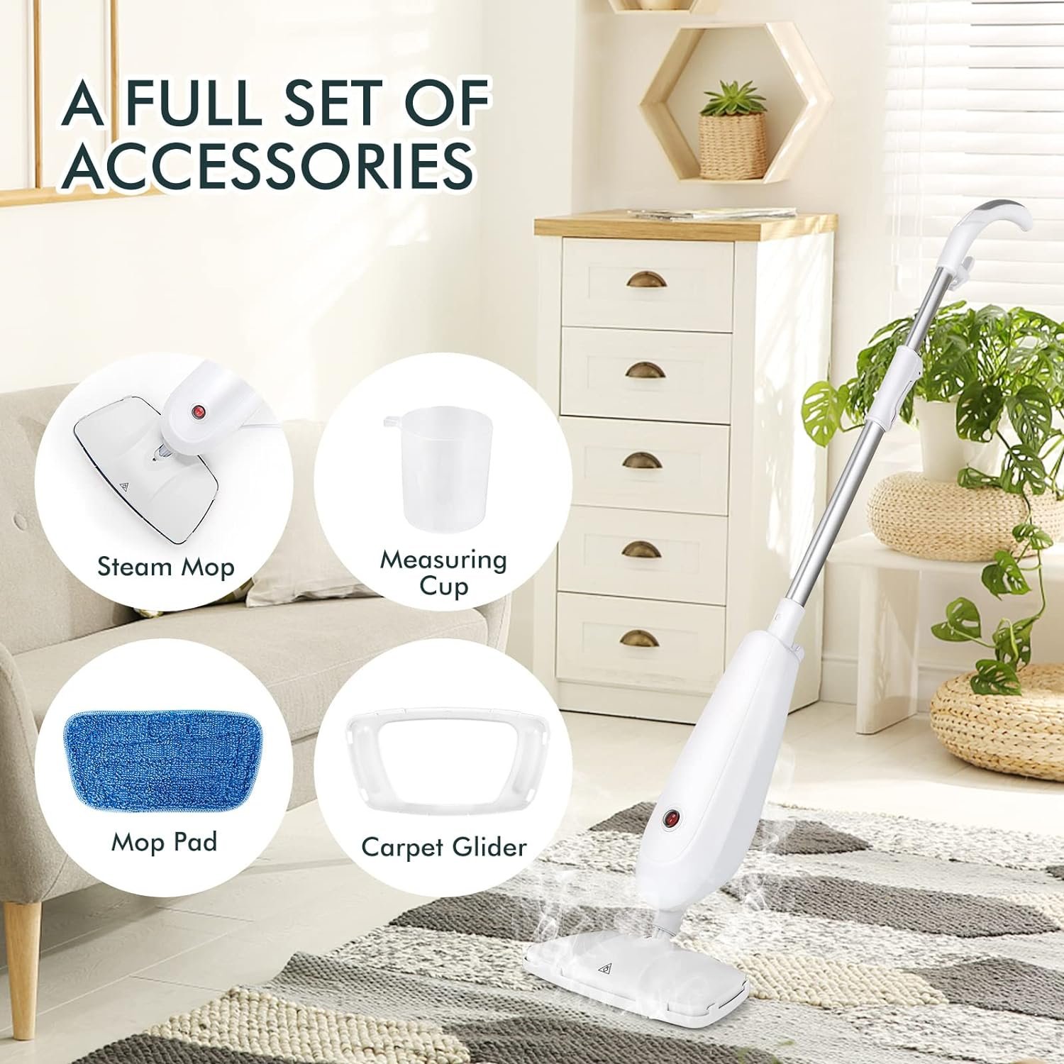 A Full Set of Accessories: Our steam mop comes with a measuring cup, a carpet glider, and 2 washable and reusable mop pads for convenient use. Each attachment is convenient to install in a short time.