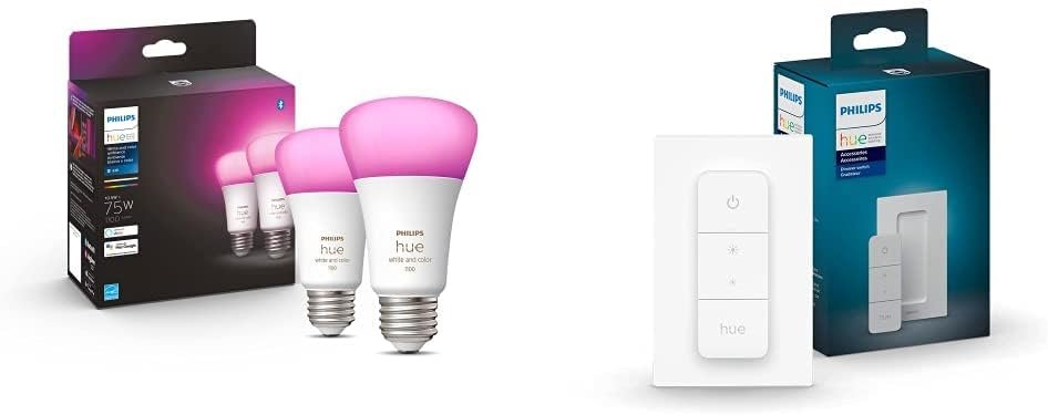 Includes 2x 75W-equivalent (10.5W) Philips Hue A19 smart LED light bulbs and 1 Philips Hue smart dimmer switch to control lights
