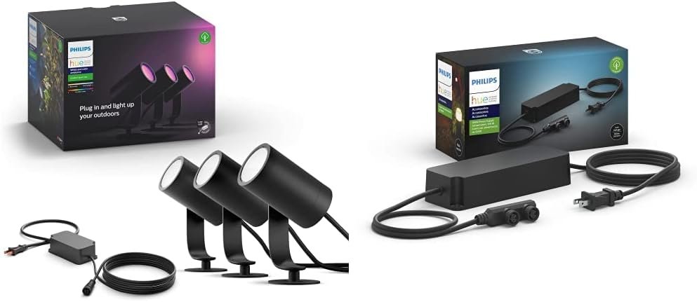 Plug in and light up your outdoors with Philips Hue outdoor lighting. Requires Hue hub to use, sold separately. Simply plug in and connect to your existing Hue hub to enjoy the 16 million colors available to enhance the beauty of your yard or create any ambiance you like. This dusk to dawn light bulbs base kit provides 3 light points and Power supply plus all cables you need to get started. Lily landscape spots are fully weather-proof.