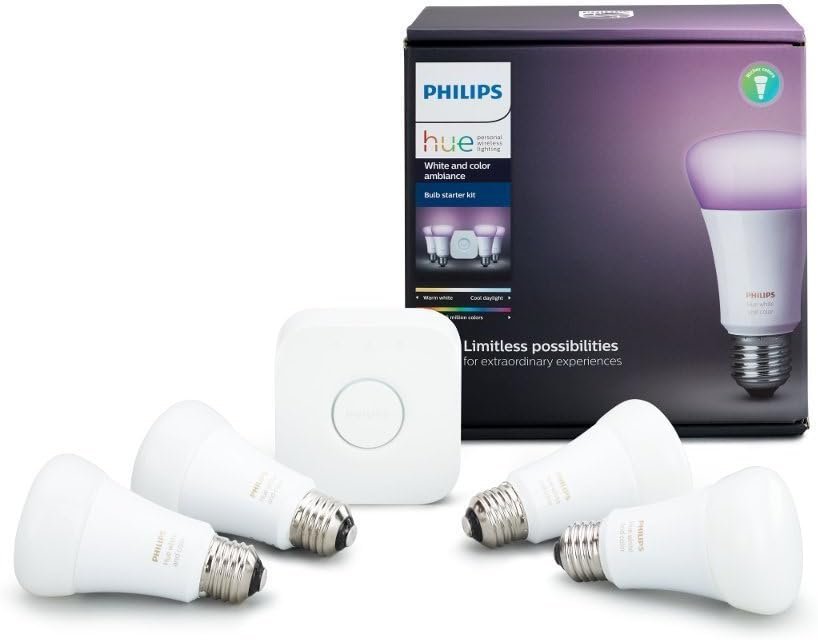 Philips Hue White and Color Ambiance A19 60W Equivalent LED Smart Bulb Starter Kit (4 A19 Bulbs and 1 Hub Compatible with Amazon Alexa Apple HomeKit and Google Assistant)