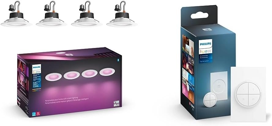 Philips Hue White and Color Ambiance Extra Bright Dimmable Recessed LED Smart 6″ Downlight for Retrofit Cans (4 Pack) Wall Tap Dial Light Switch