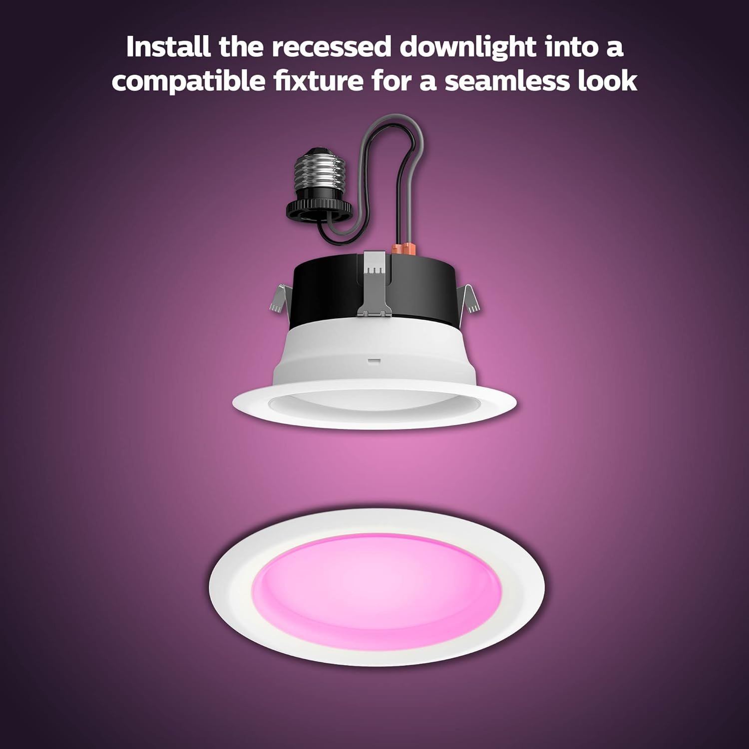 Product 1: Extra bright color and warm-to-cool white light. Have the ambiance and brightness you need with the Philips Hue White and Color Ambiance 6-inch downlight. Perfect for retrofitting your E26 medium base recessed lighting with a smart, LED downlight.