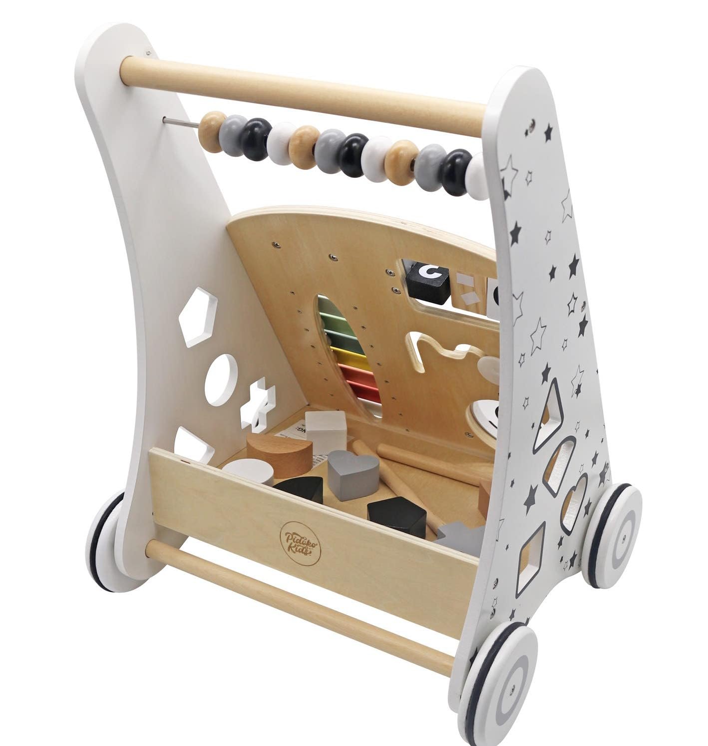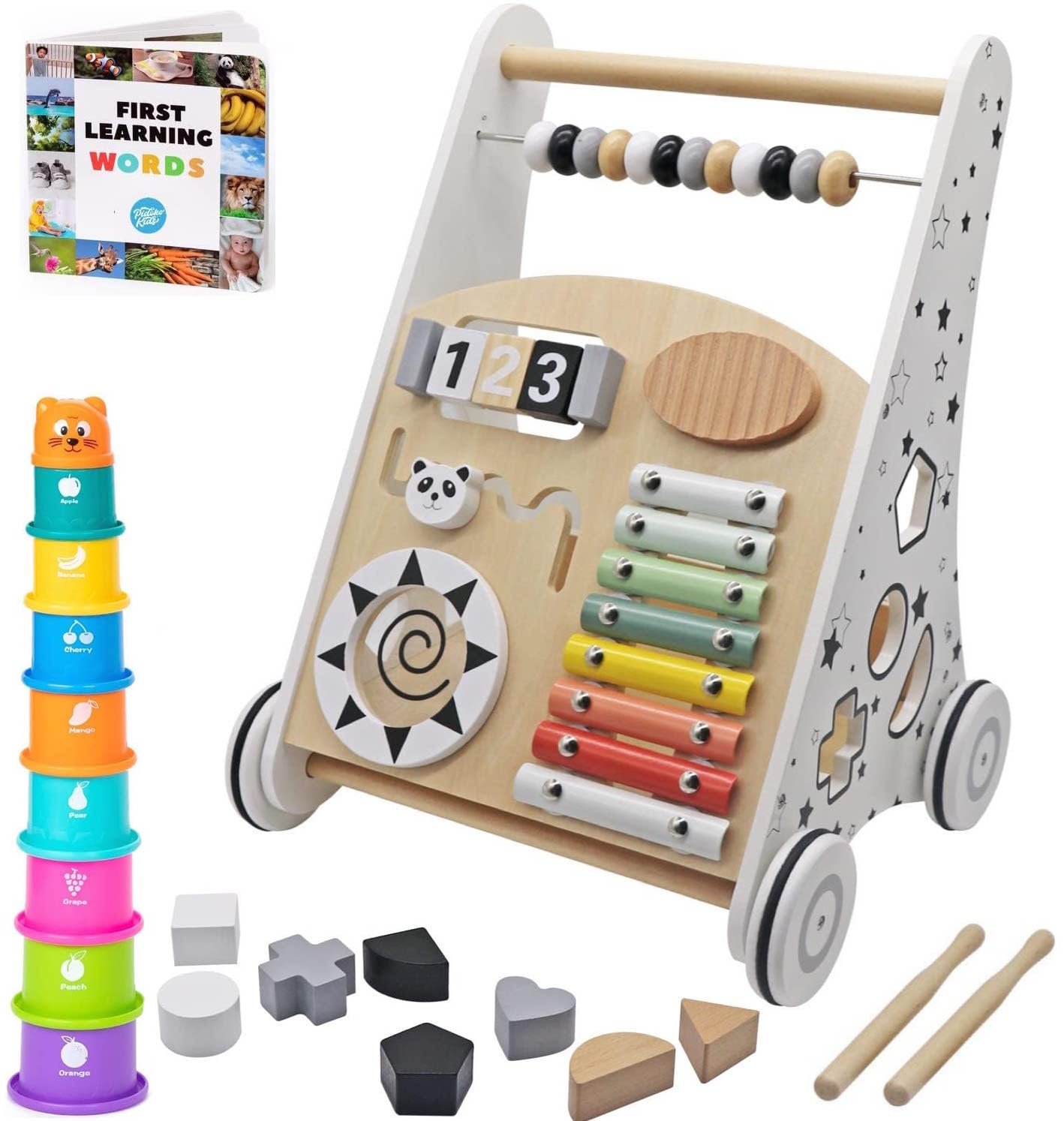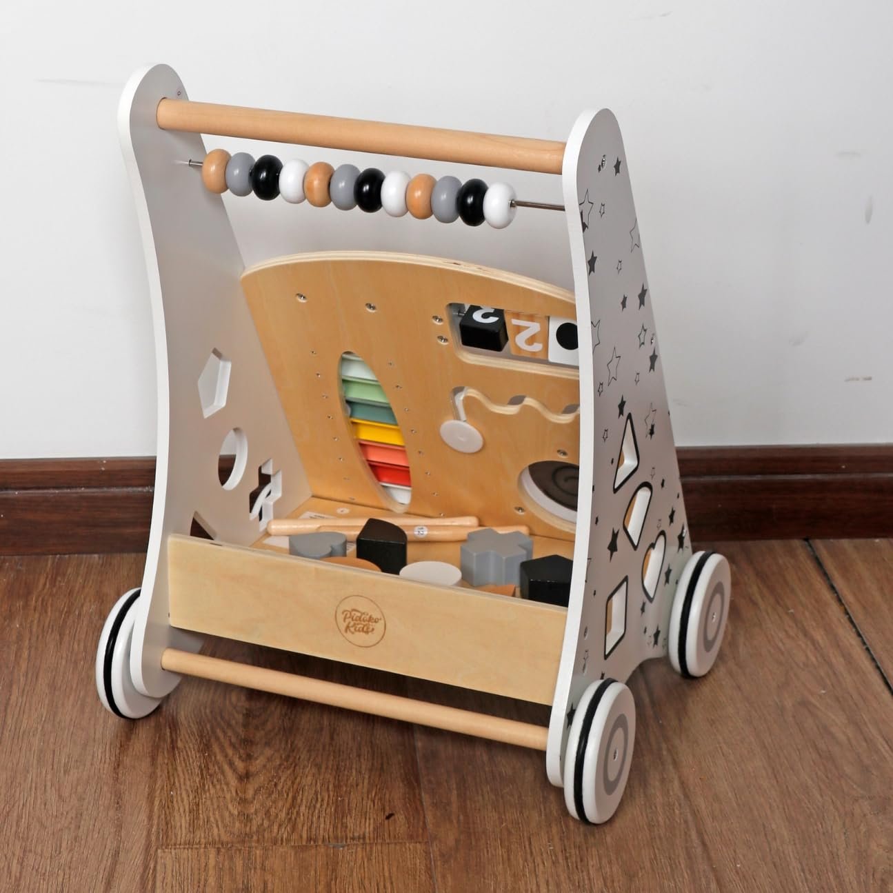 MULTIPLE ACTIVITY CENTER – Shapes Sorter, Xylophone, Drum, Abacus and more! Smartly designed activities that will not only inspire children, but also enhance their fine motor skills, creativity and imagination, problem solving and social skills. Wooden walker. Baby push walker. Wooden baby activity walker. Push toys for babies learning to walk. Wooden walkers for babies. One year old boy toys and girls.
