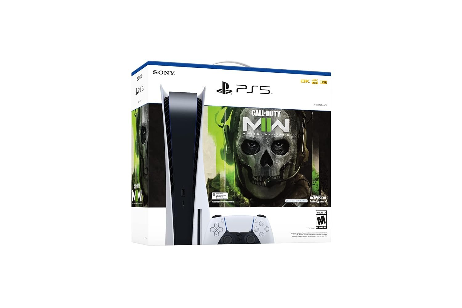 Bundle includes: PlayStation 5 console, DualSense Wireless Controller, Base, HDMI Cable, AC power cord, USB cable, Call of Duty: Modern Warfare II – Cross-Gen Bundle full game voucher.