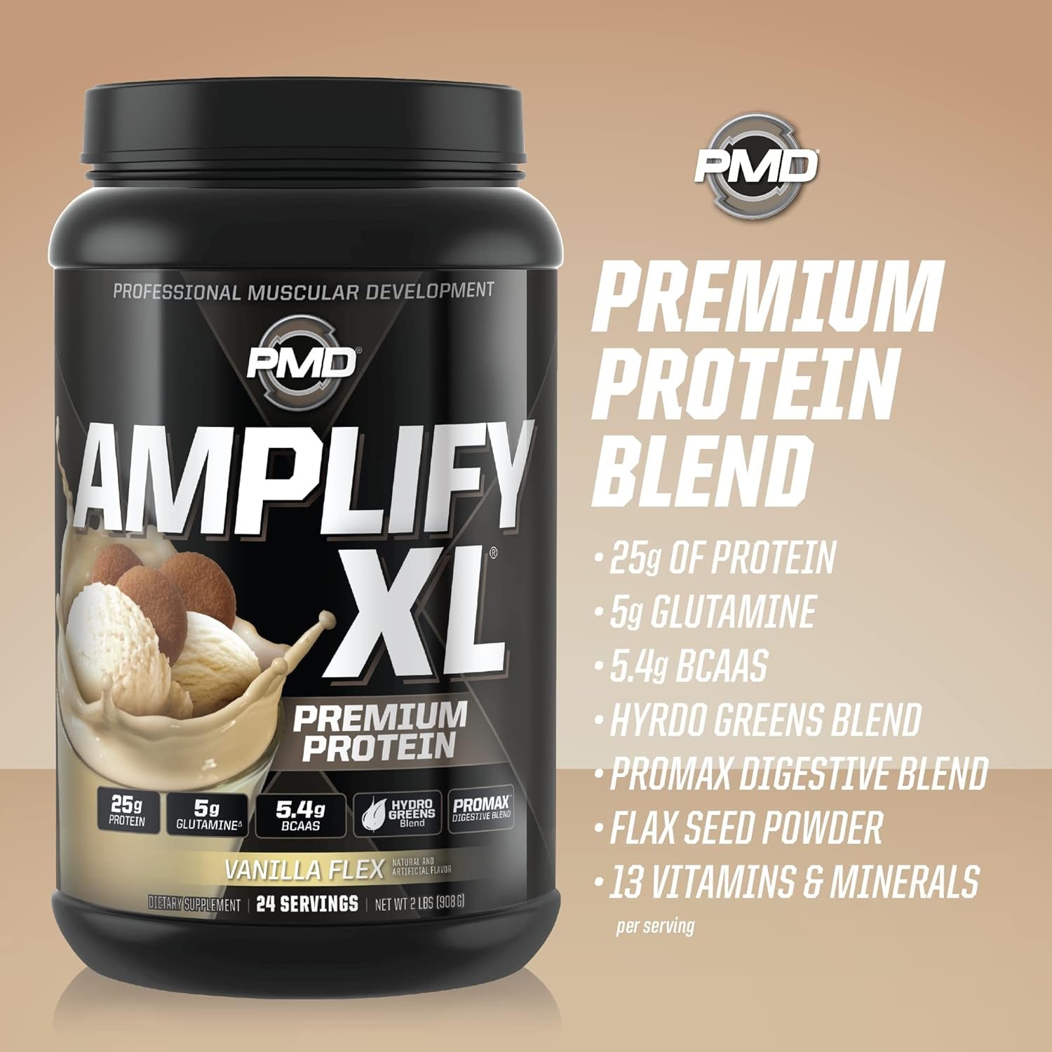 Superior Quality: Amplify XL is a great tasting protein powder supplement for complete muscle building and recovery. Amplify XL is a precision mix of high-grade protein, glutamine, and branch chain amino acids (BCAAs) designed for complete muscle recovery and repair after workouts and to support overall health. Fortified with digestive enzymes, flax seed powder and supported by a large array of vitamins and minerals from the unique Hydro Greens Blend for overall good health and well being.
