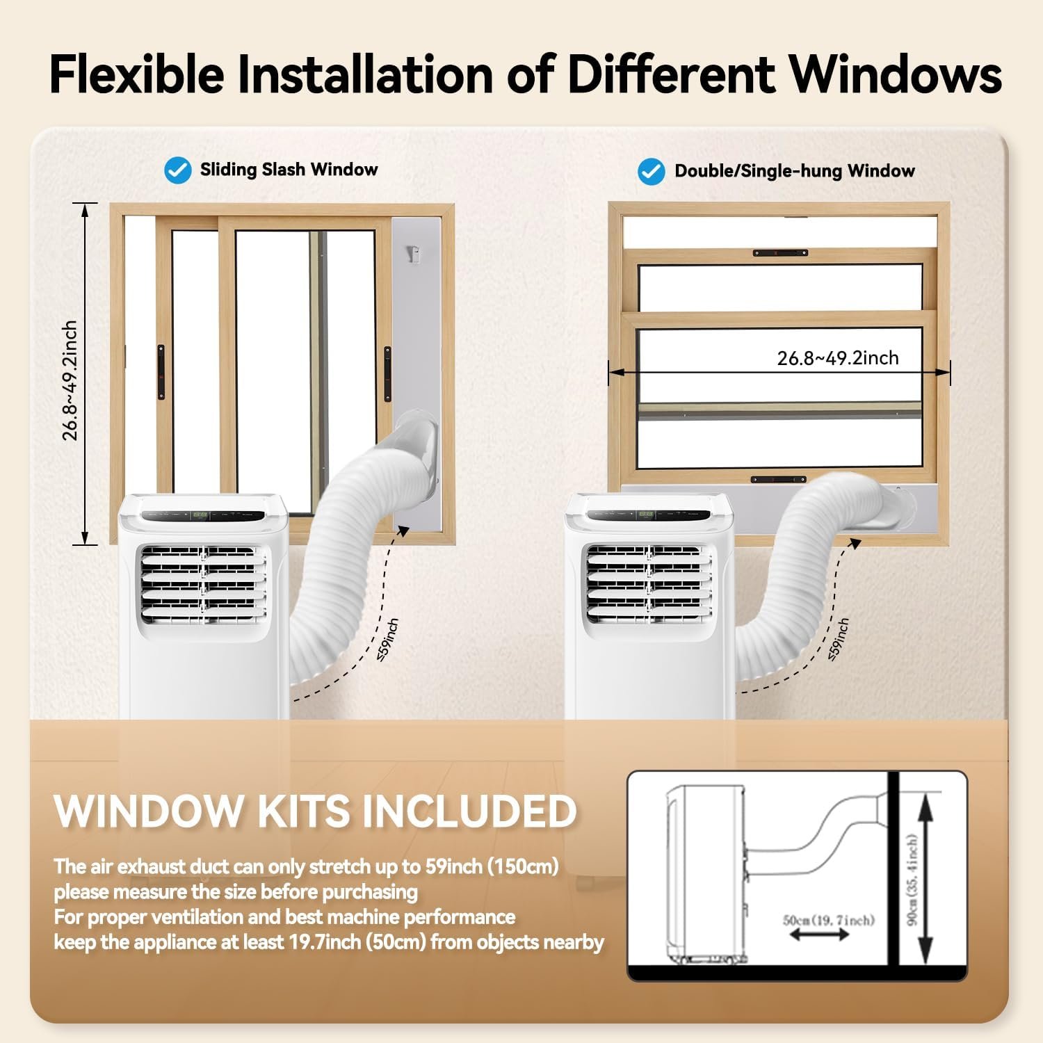 ❄️Easy to Install & Move❄️The size of this room air conditioner is 11.2” L x 11.8” W x 26.4” H and will not occupy too much space. The detailed instructions in our user manual allow you to set up in 15 minutes or less. Just roll this portable air conditioner with wheels into any room.