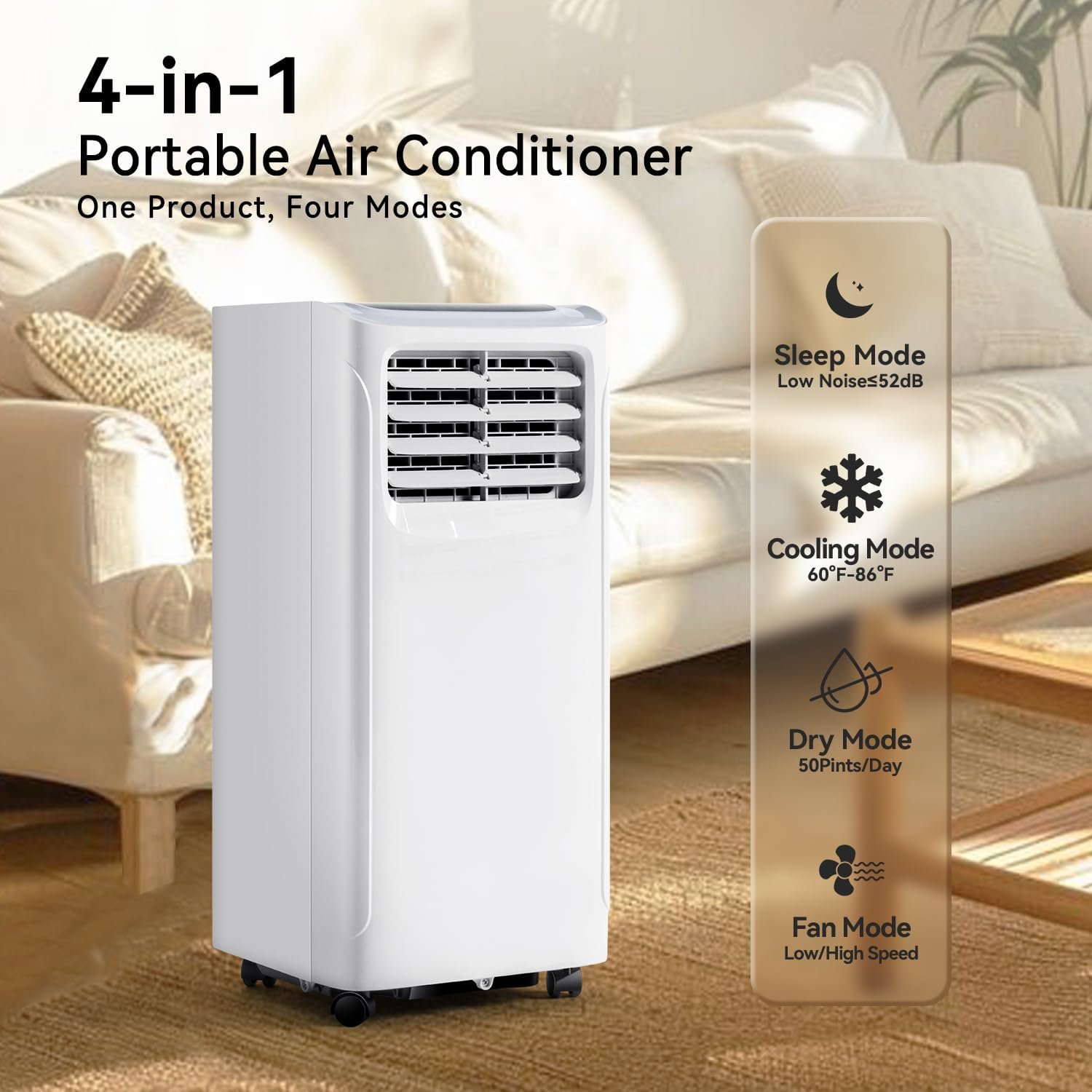 ❄️4-In-1 Functionality❄️Our portable air conditioner is not only a AC unit, but also a fan and dehumidifier, which includes 3 modes to choose from-Cool, Dry and Fan: Cooling mode (60°F to 86°F) can cool up to 350 sq.ft, the dry mode can remove 2.09 pints (1L/hour) of water per hour, air flow is rated at 360 M3/hr. Ft, providing you with a healthy and comfortable environment.