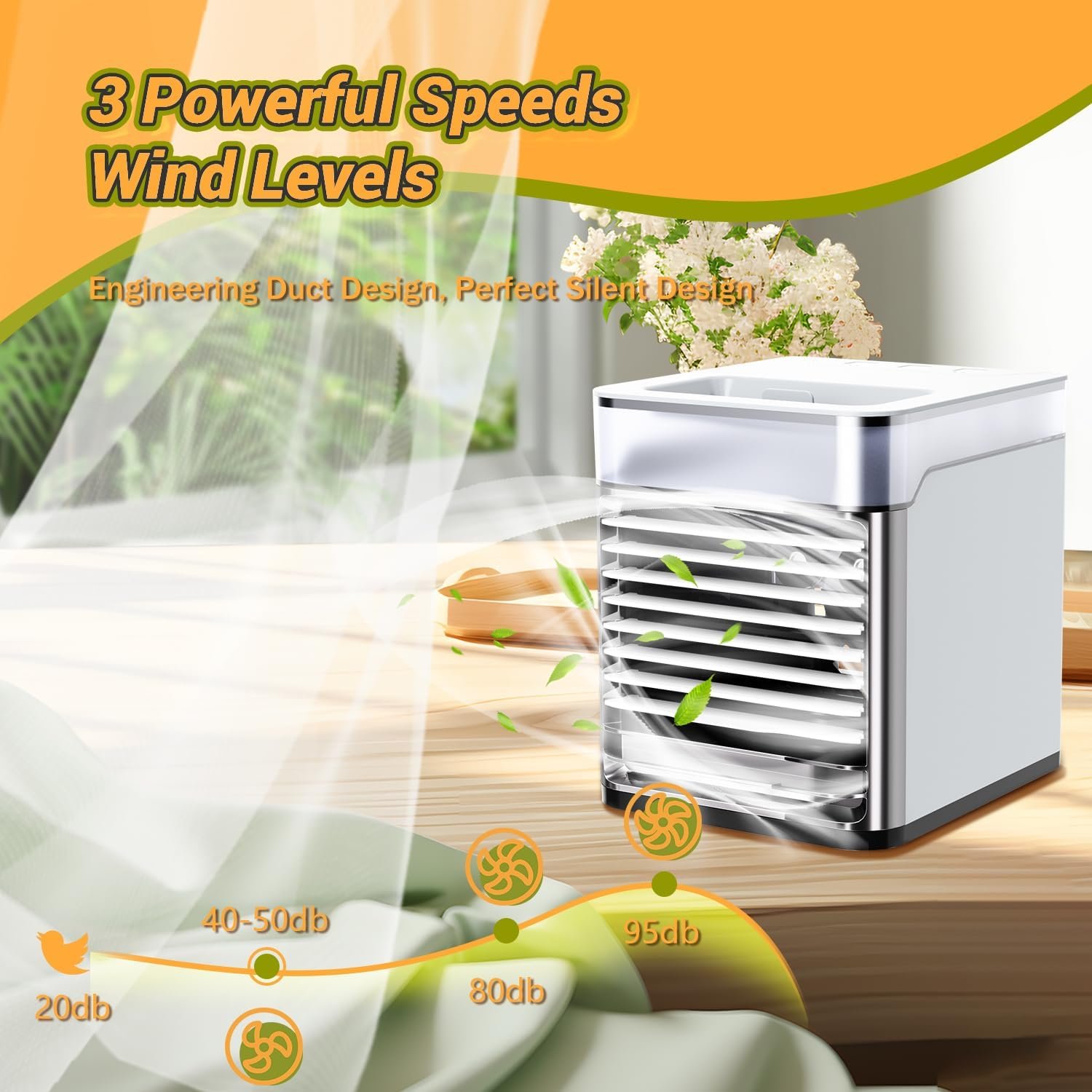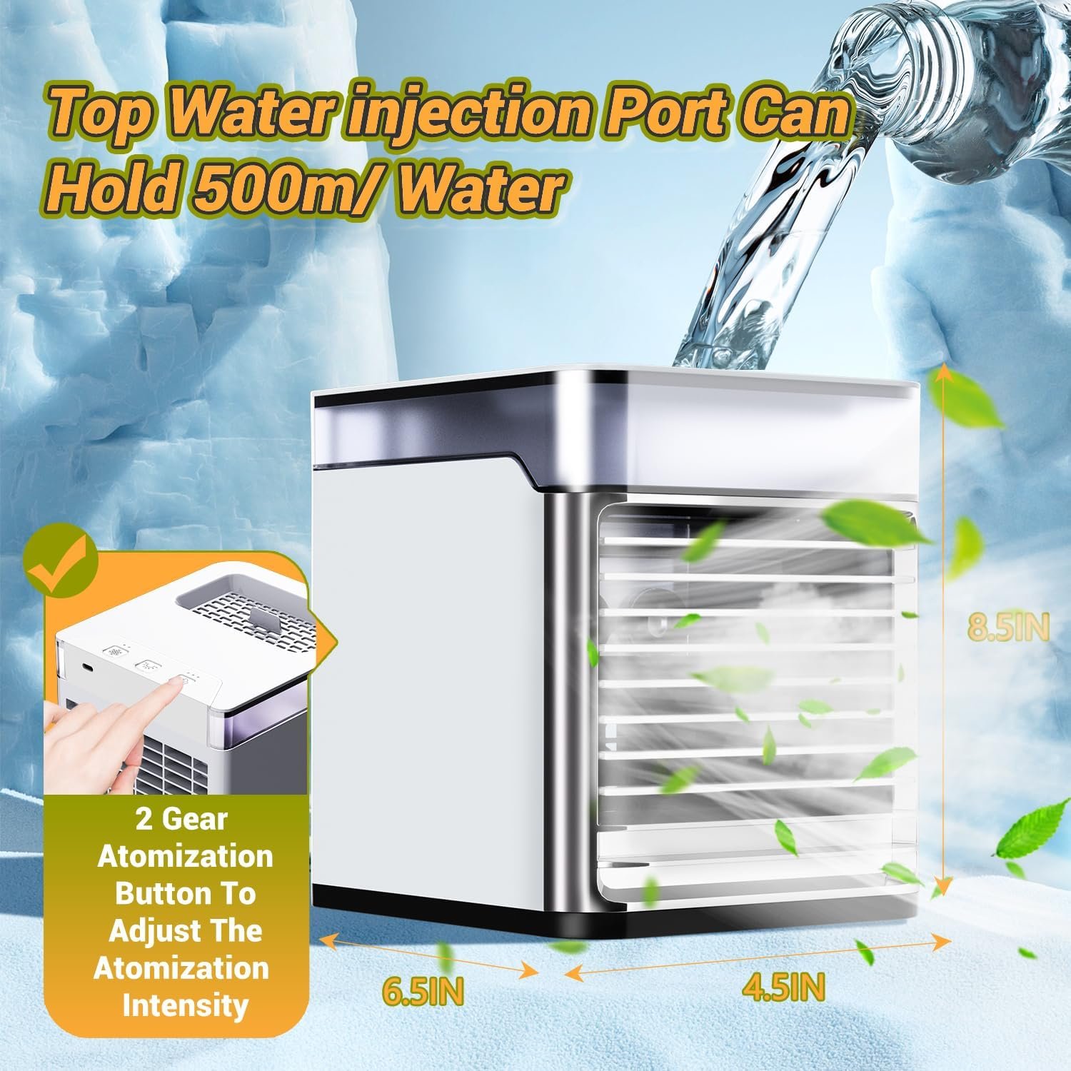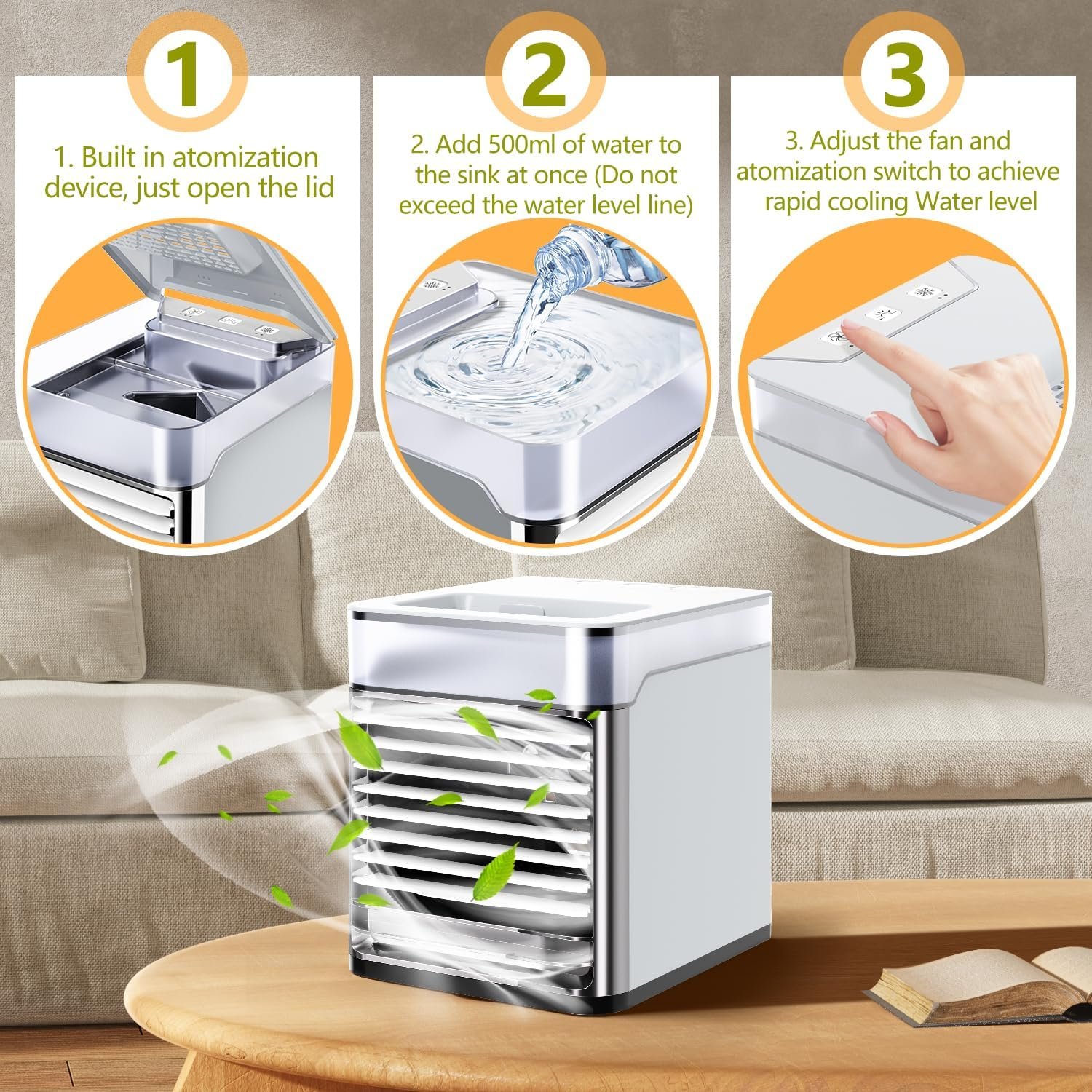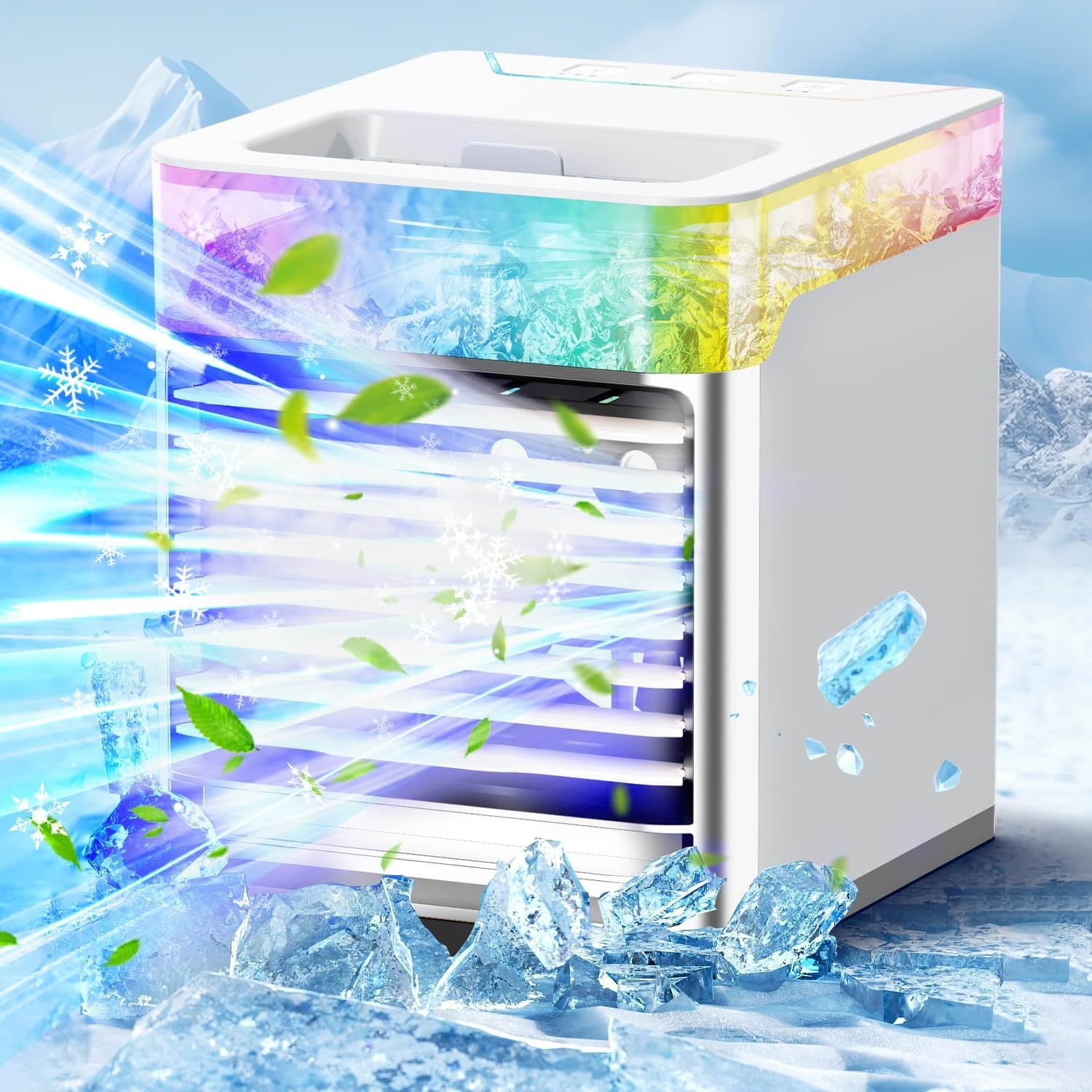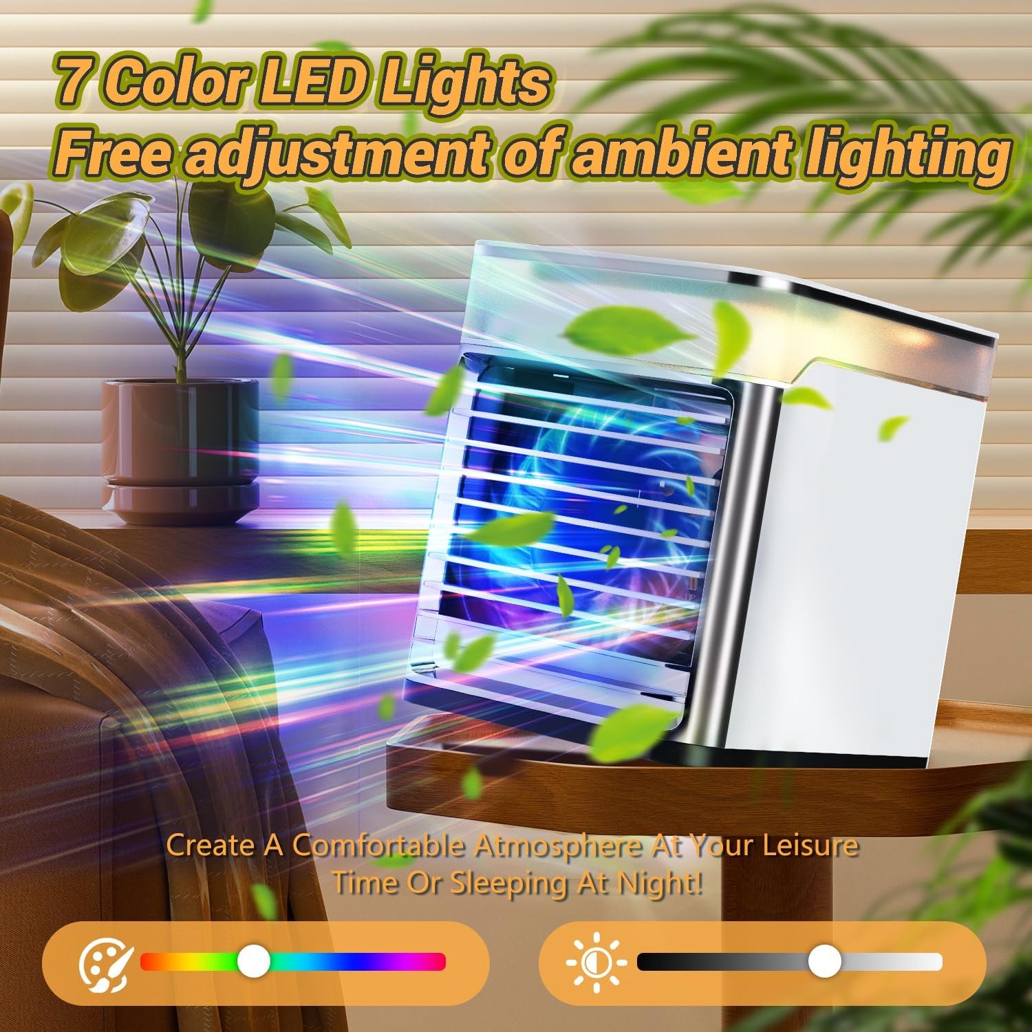 Portable Air Conditioner, Personal Mini Air Conditioners with 3 Speeds & 2 Mist Modes, 3000 mAh Battery Mini Air Cooler with 7-Color Night Light, Evaporative Air Cooler for Office Desk Home Camping
