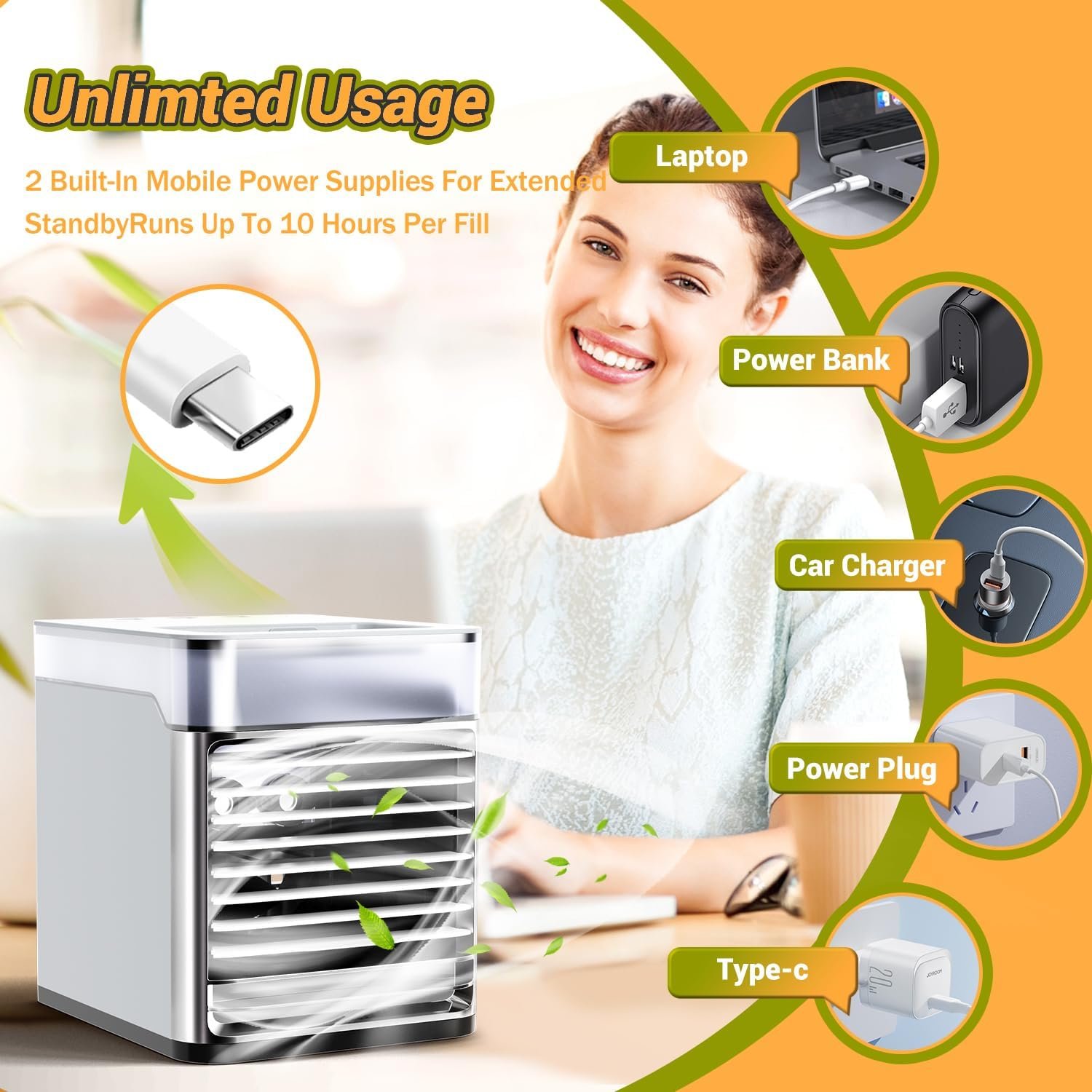 Just add water and ice to the water tank, connect the USB and turn on the device, then relax and enjoy a fresh and moist breath. Use our mini air conditioner portable helps to create your personal comfort zone.