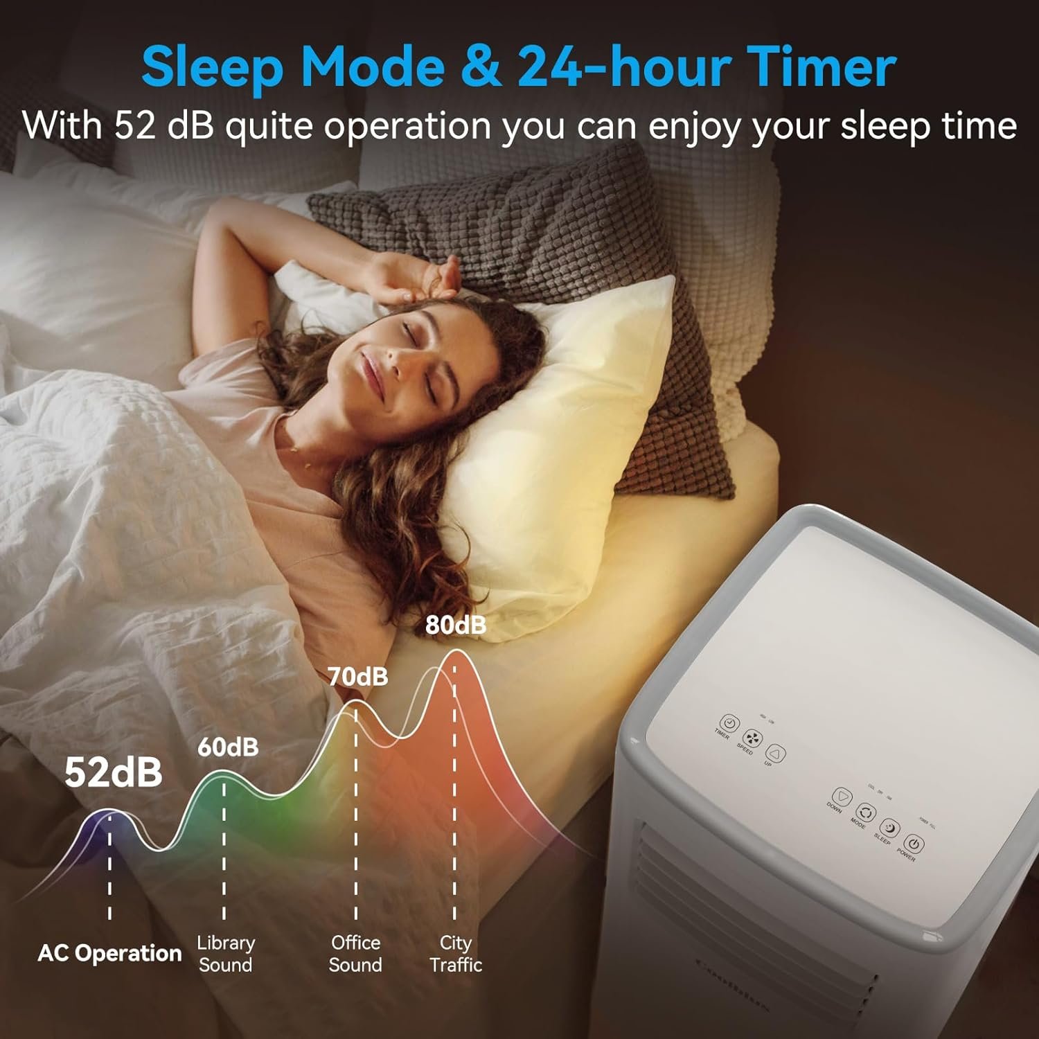 Sleep Mode & 24-hour Timer : Activate the Sleep Mode on our portable air conditioner that activated by pressing Increase and Speed simultaneously, ensures energy-saving and featuring an ultra-low noise level of 52 dB. Drift into a peaceful slumber without disturbance, And take control of your comfort with the built-in 24-hour timer, Customize the cooling duration to suit your lifestyle, ensuring a refreshing environment whenever you need it.