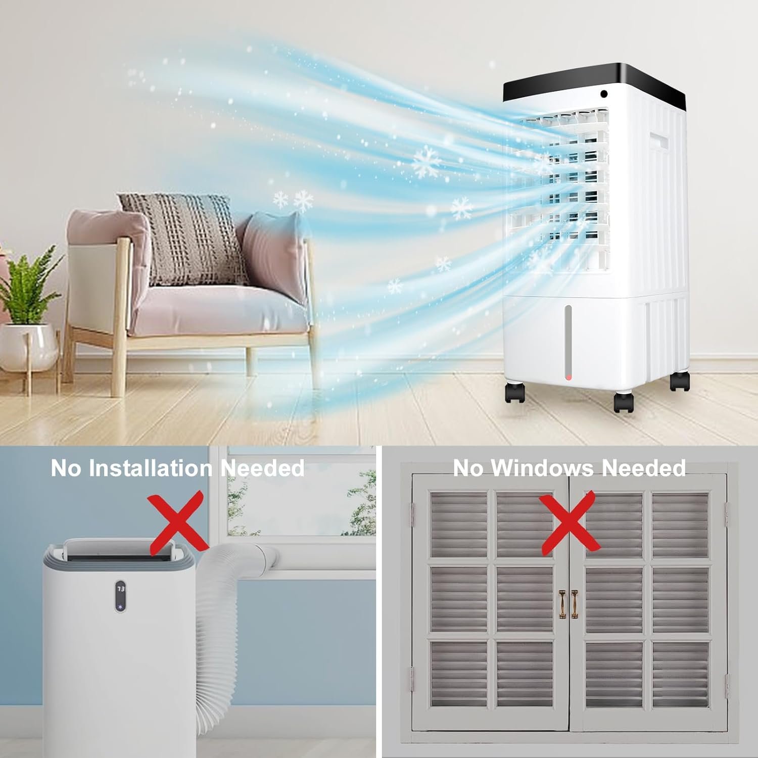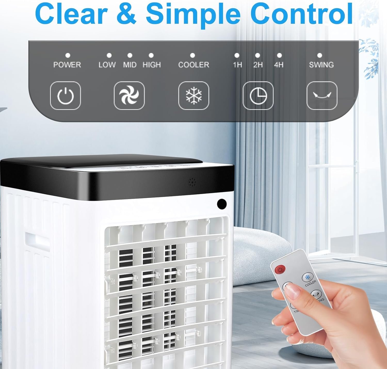 😊【User-friendly & Intuitive Controls】: The air cooler is easy to operate, and the controls and buttons for each function adopt a simple and clear design. With a clear and intuitive design, you can easily set the cooling speed, mode, and other features of the portable air conditioner. The air conditioners come with a remote control, so you can easily set the air cooler even without getting up. Whether you’re tech-savvy or not, you can easily get the most out of the user-friendly air cooler.