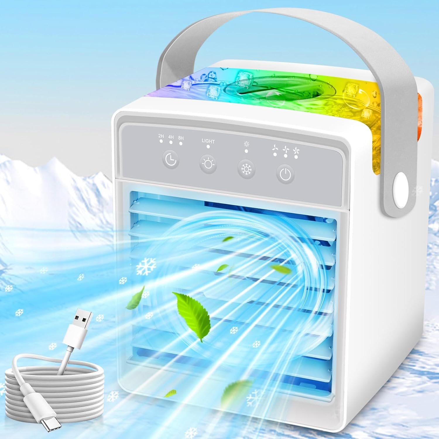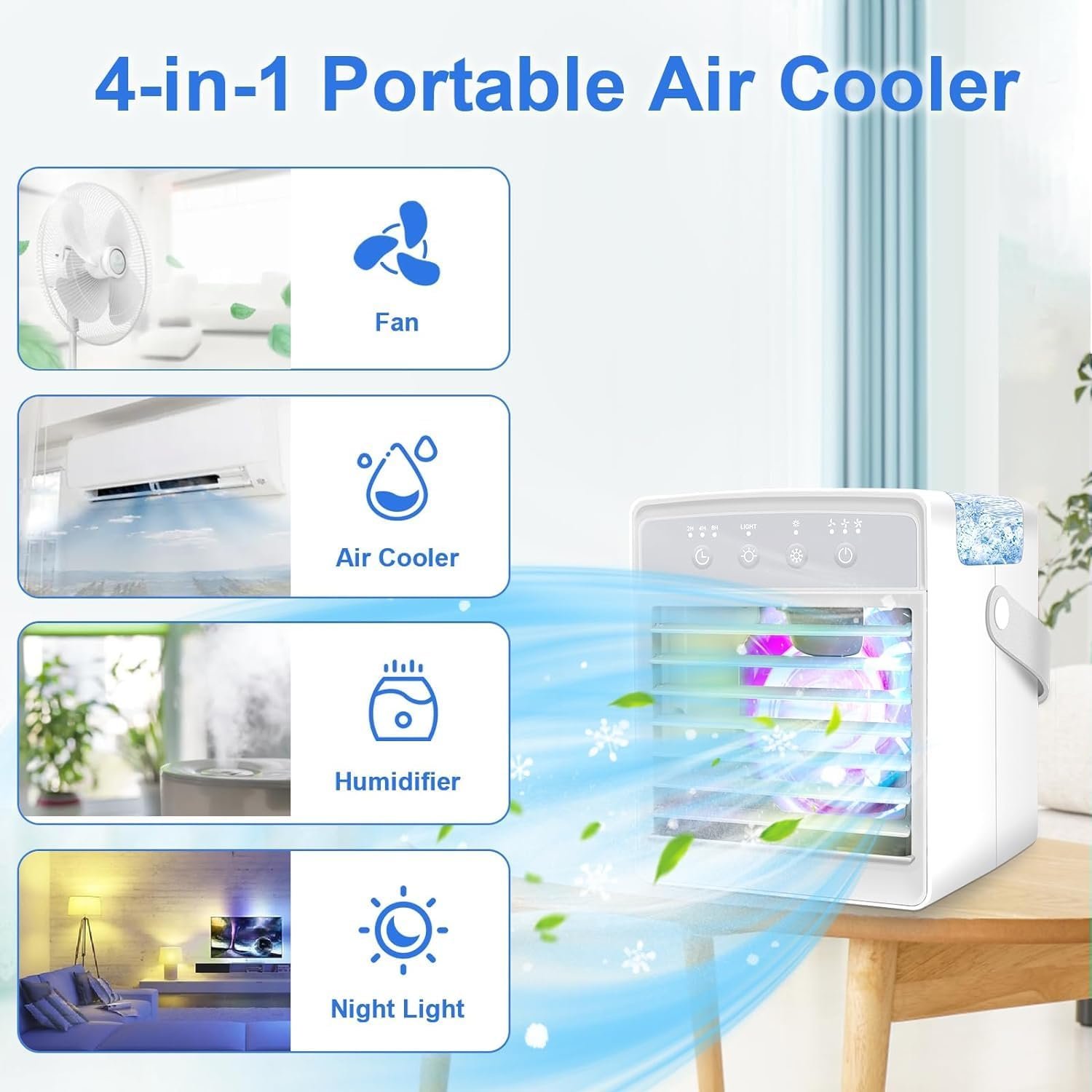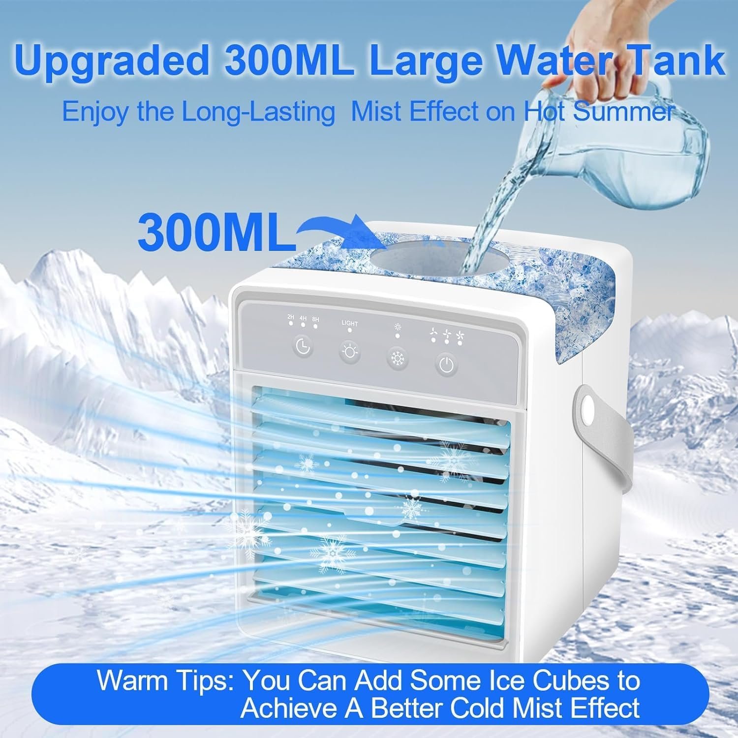 ❄️【2024 Upgraded Portable Air Conditioners】The portable air conditioners can be used as desktop cooling fan, mini air conditioner, air humidifier, 7-color night lights. The upgraded larger 300ML water tank allows you to enjoy the humidification effect for up to 8 hours in the hot summer. 2024 Upgraded powerful cooling technology allows you to feel the cooling in seconds, turning on the air conditioner to bring you a cooling summer.